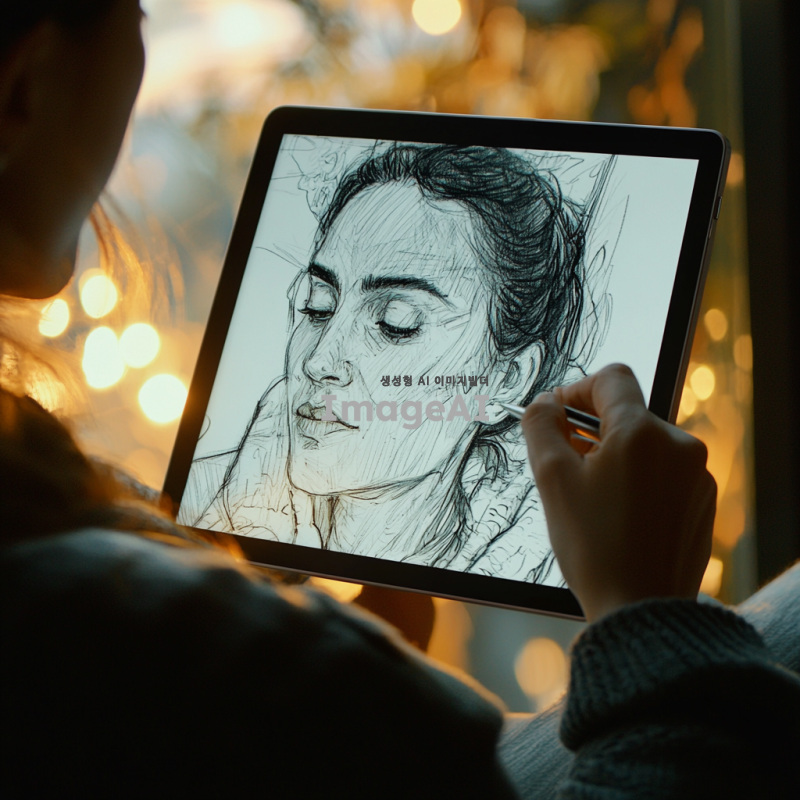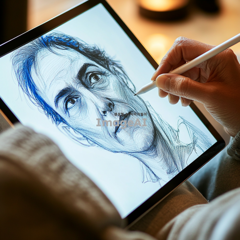 타블렛으로 인물 스케치를 그리는 사람의 모습, 집중한 표정, 현대적인 작업 공간, 자연광이 비치는 창문, 창의적인 분위기, 디지털 아트 작업 중인 장면, 세밀한 손동작, 테크놀로지와 예술의 조화, 편안한 의자에 앉아 있는 모습, 따뜻한 색감의 조명.