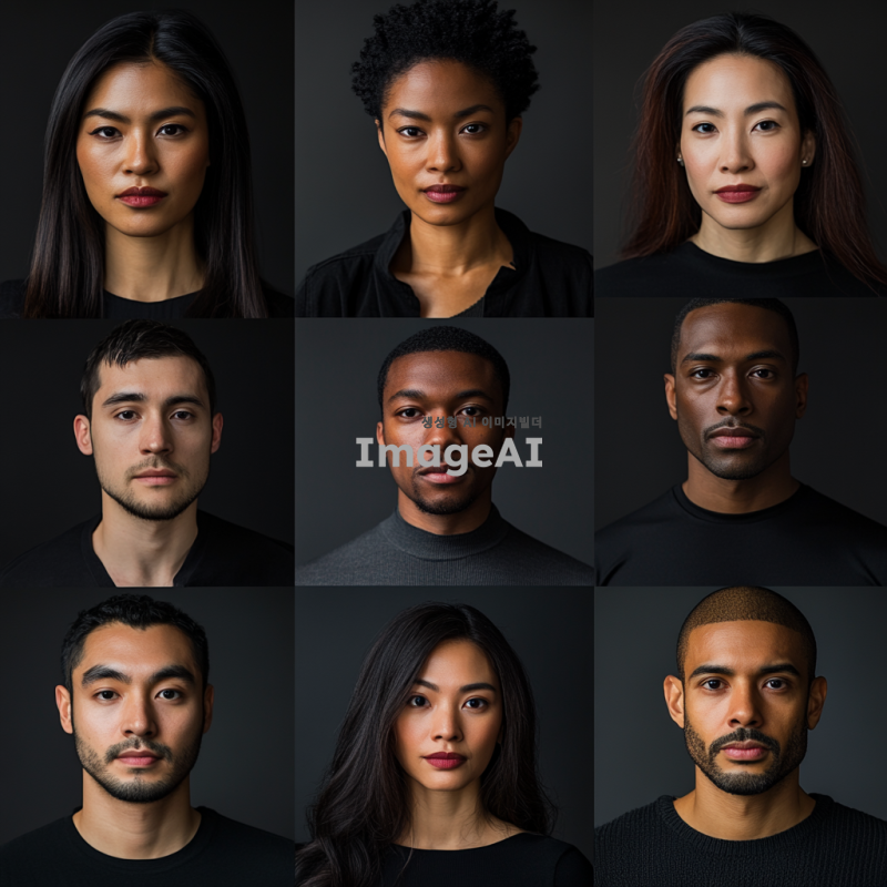 아시아인, 미국인등을 포함한 다양한 인종의 남성과 여성의 증명사진, 각각의 인물은 정면을 바라보고 있으며, 자연스러운 표정을 짓고 있음. 배경은 단색으로 깔끔하게 처리되어 있으며, 인물의 얼굴이 명확하게 드러나도록 조명은 부드럽고 균일하게 설정. 인물들은 각각 다른 인종적 특징을 반영하여, 아시아인, 아프리카계, 유럽계, 라틴계 등 다양한 인종을 대표. 각 인물은 포멀한 복장을 하고 있으며, 헤어스타일은 단정하게 정돈되어 있음.