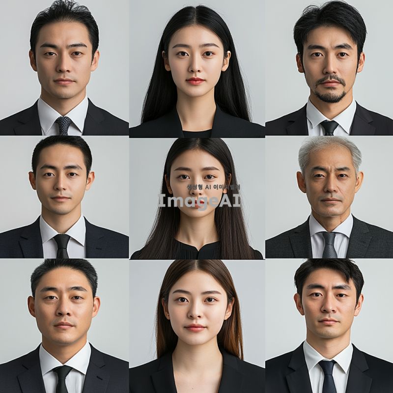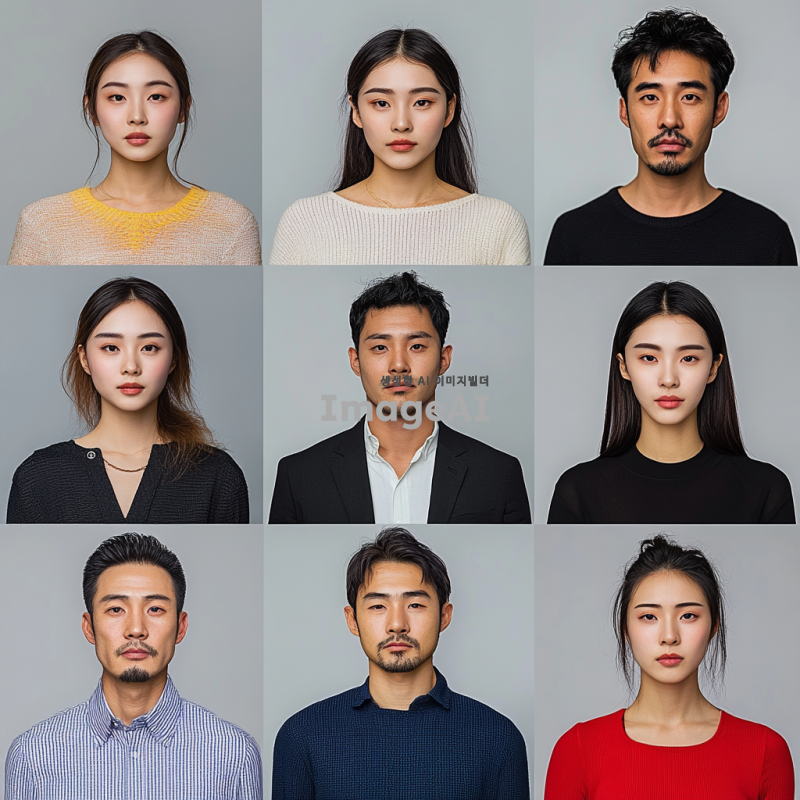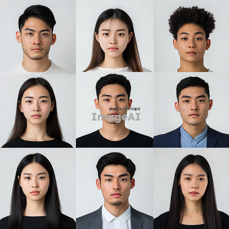 아시아인과 미국인등을 포함한 다양한 인종의 남녀 증명사진, 정면 얼굴, 자연스러운 표정, 깨끗한 배경, 다양한 피부 톤과 헤어 스타일, 전통적이거나 현대적인 의상, 조명 균일, 고해상도, 현실적이고 선명한 디테일, 성별과 연령대의 다양성 포함.