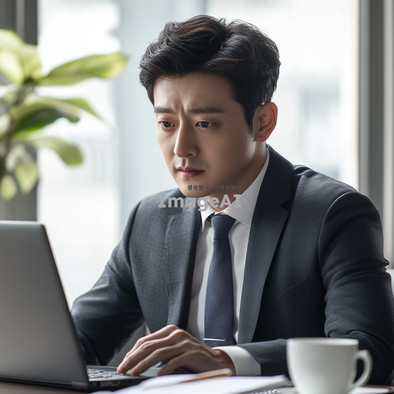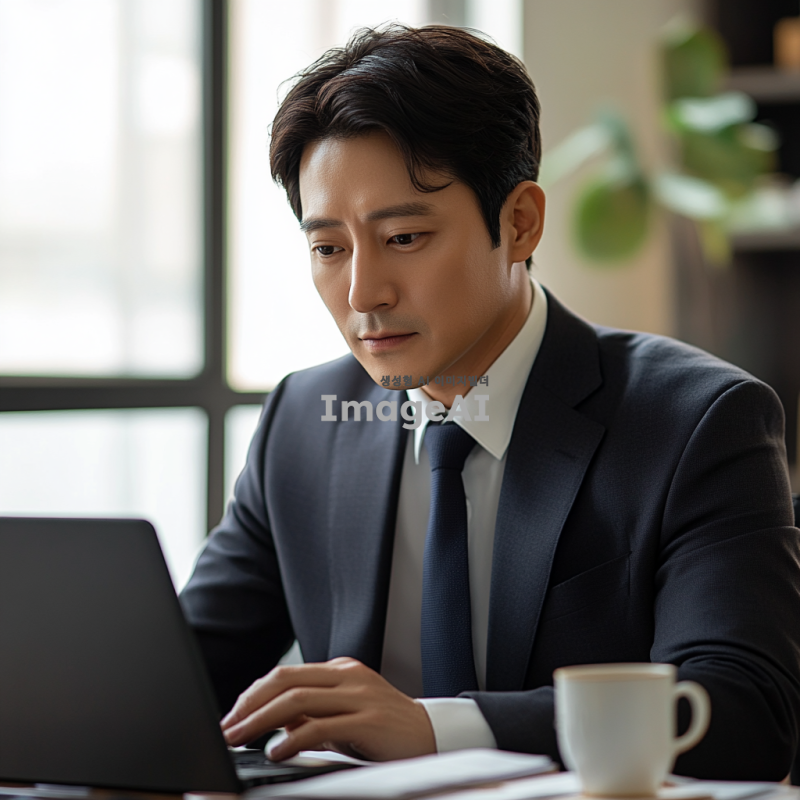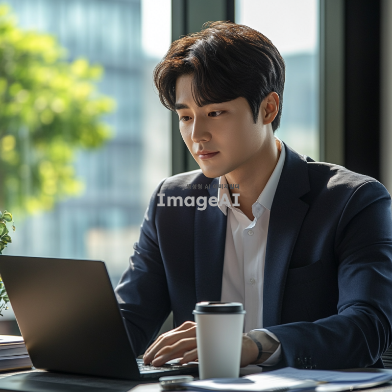 30대 한국인 남성 직장인, 깔끔한 정장 차림, 현대적인 사무실 배경, 노트북 앞에서 일하는 모습, 집중한 표정, 자연광이 들어오는 창문, 책상 위에 커피잔과 서류, 전문적이고 신뢰감 있는 분위기