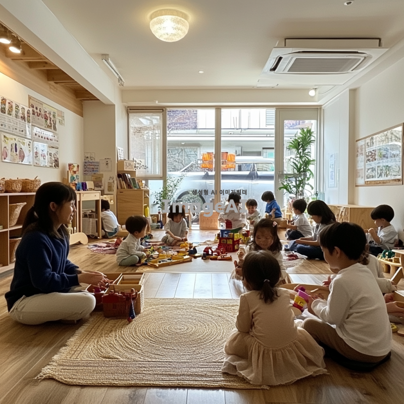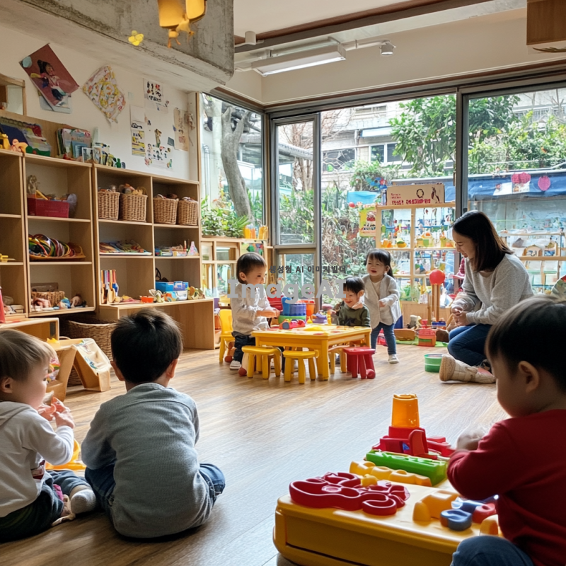 밝고 환영하는 분위기의 직장 내 어린이집, 다양한 인종의 아이들이 함께 놀고 있는 모습, 안전하고 깨끗한 환경, 친절한 교사들이 아이들과 상호작용하는 장면, 다채로운 장난감과 학습 도구가 구비된 공간, 자연광이 잘 들어오는 넓고 아늑한 실내, 아이들의 웃음소리가 들릴 것 같은 활기찬 분위기.