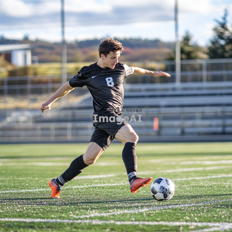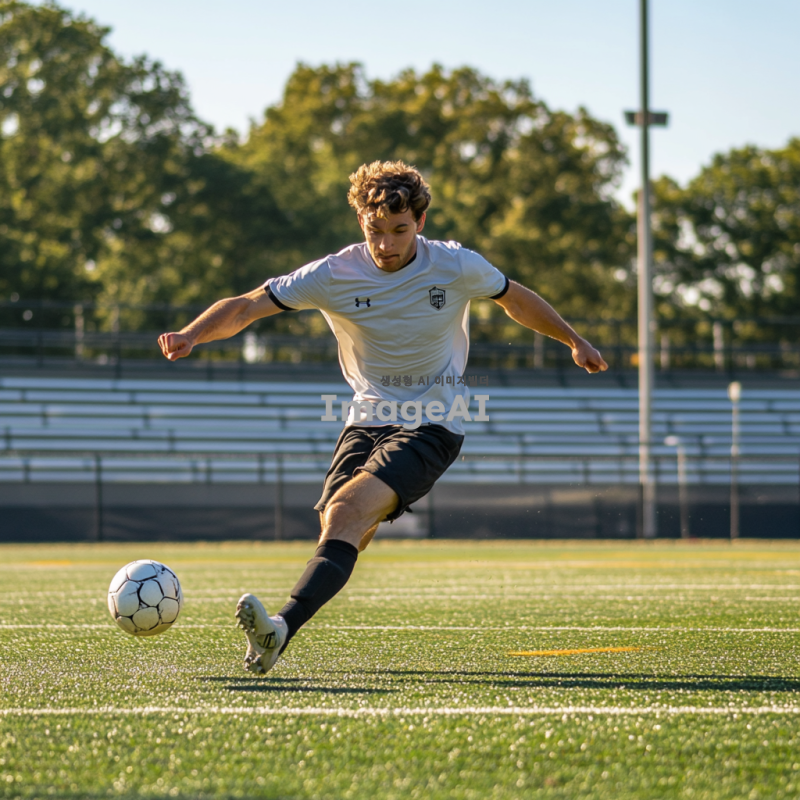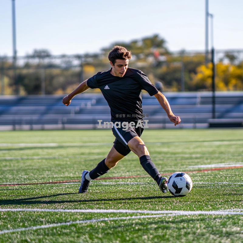 20대 초반 남성이 축구 경기장에서 축구공을 차는 역동적인 모습, 밝고 화창한 날씨, 잔디가 무성한 경기장, 남성은 운동복을 입고 있으며 집중한 표정, 배경에 희미하게 보이는 관중석