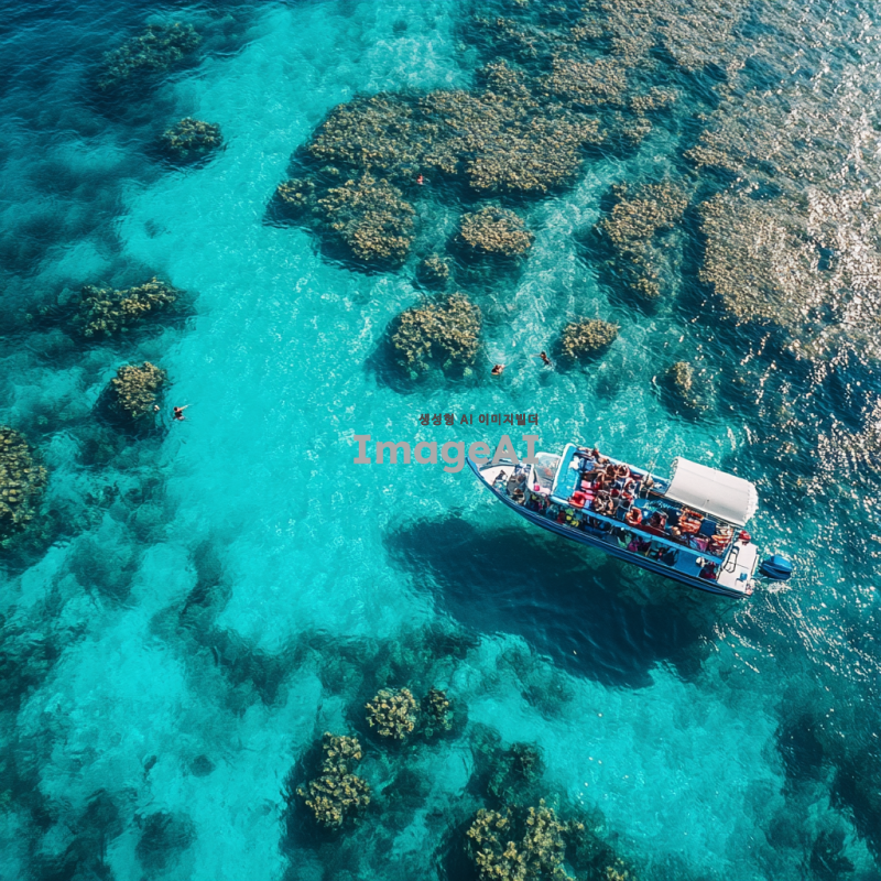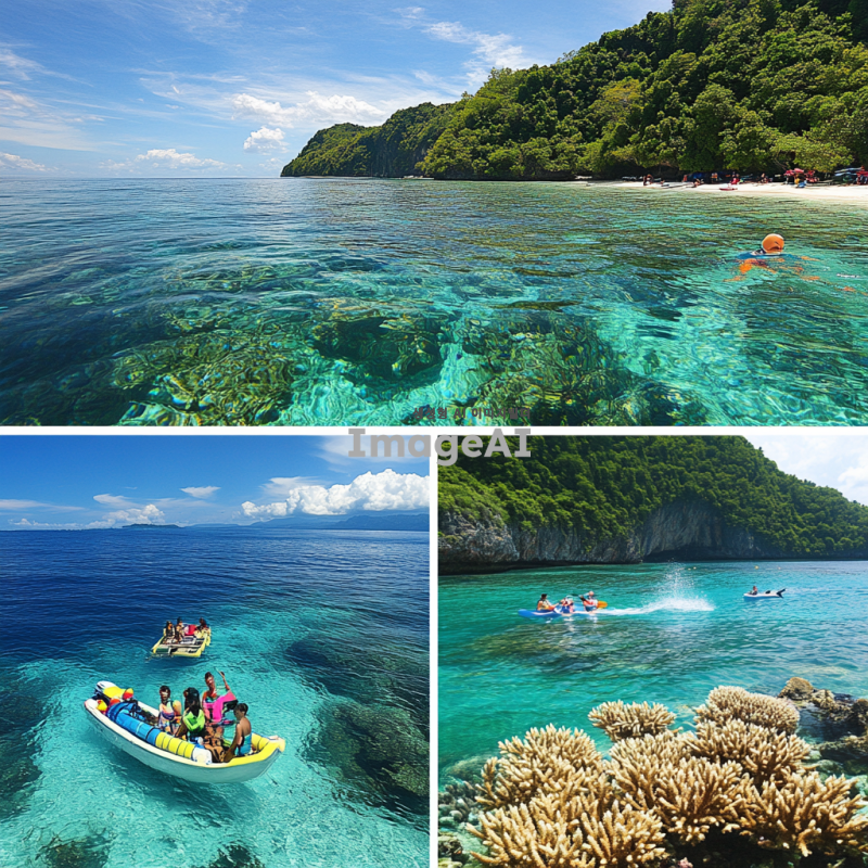 열대 바다의 맑고 푸른 물결 위에서 즐기는 호핑투어, 다양한 색상의 산호초와 열대어가 가득한 해양 생태계, 작은 보트에 탄 사람들이 스노클링 장비를 착용하고 물속을 탐험하는 모습, 햇살이 반짝이는 해변과 주변의 푸른 섬들, 여행자들이 즐거운 표정으로 물놀이를 즐기고 있는 장면, 따뜻한 기후와 여유로운 분위기, 자연의 아름다움이 돋보이는 풍경.