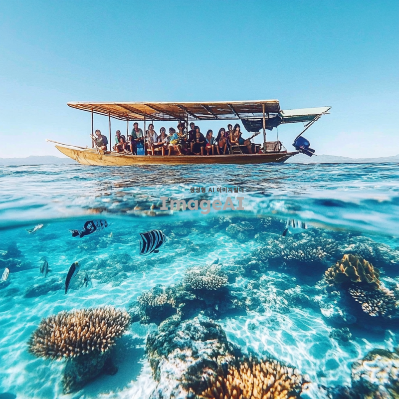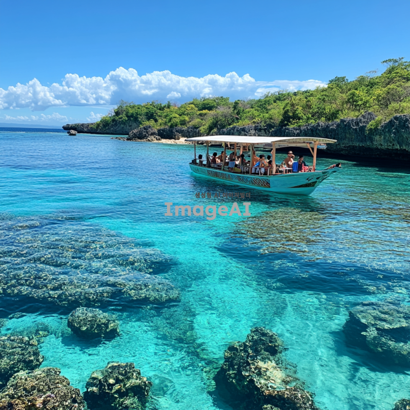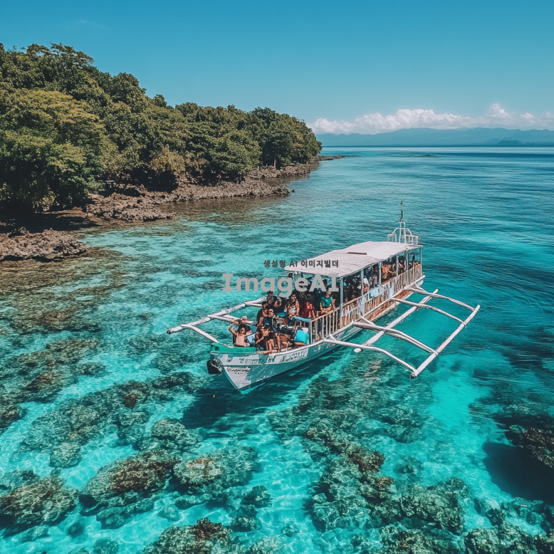 세부의 맑고 푸른 바다 위에서 방카보트를 타고 호핑투어를 즐기는 장면. 하늘은 맑고 햇살이 빛나는 날씨, 주변에는 작은 섬들이 보이고, 투명한 물 아래로 산호초와 다양한 열대어들이 헤엄치는 모습. 방카보트 위에는 여행객들이 즐겁게 웃고 있으며, 스노클링 장비를 착용한 사람들도 보임. 전체적으로 밝고 활기찬 분위기.