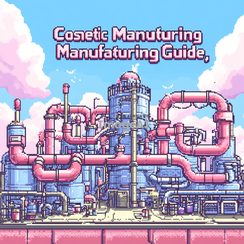 픽셀아트 스타일로 "화장품 제조 가이드"라는 제목을 중심으로 파이프 몇개 그려주고, 분홍색, 하늘색, 흰색을 섞어서 배경은 부드러운 파스텔 톤으로 설정해줘. "제조 가이드"라는 제목과 어울리게 설명서 제목처럼 그려줘.