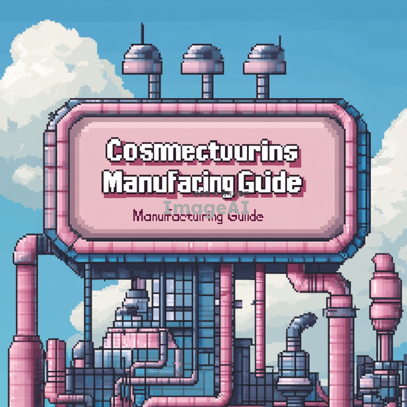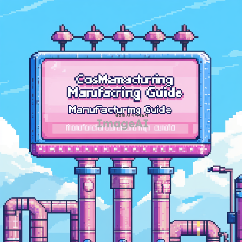 픽셀아트 스타일로 "화장품 제조 가이드"라는 제목을 디자인해줘. 배경 필요없이 간판만 디자인해줘. 간판디자인에 파이프 몇개 추가해주고 "화장품 제조 가이드" 라는 문장은 두줄로 배치해줘. 간판디자인 할 때 테두리가 있었으면 좋겠어.