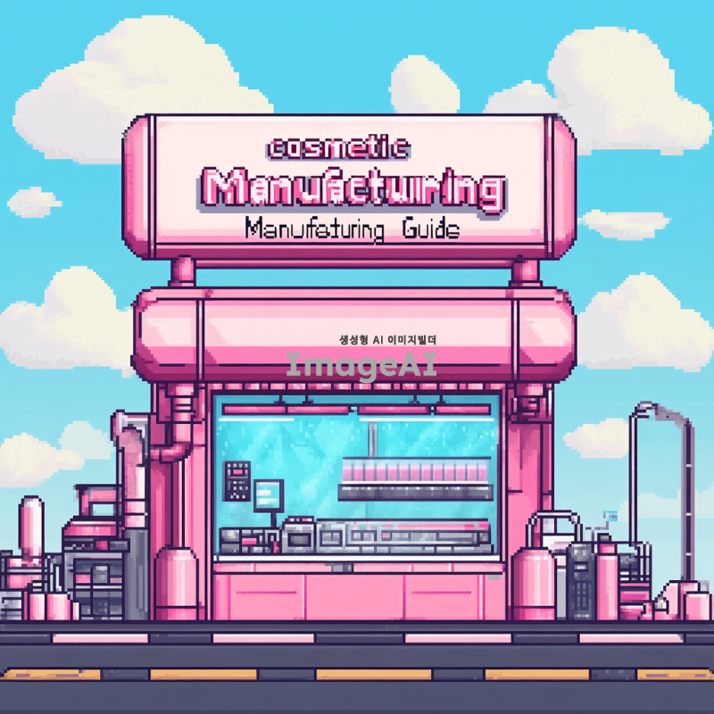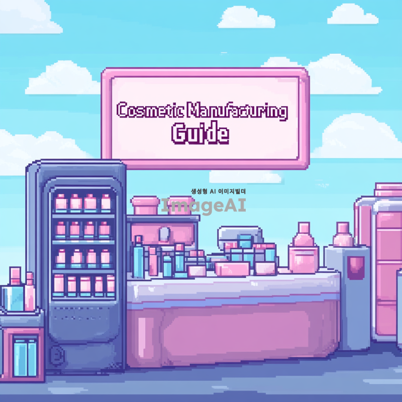 픽셀아트 스타일로 "화장품 제조 가이드" 타이틀을 디자인해줘. 게임 시작 화면 느낌으로, 분홍, 하늘, 흰색을 사용해줘.