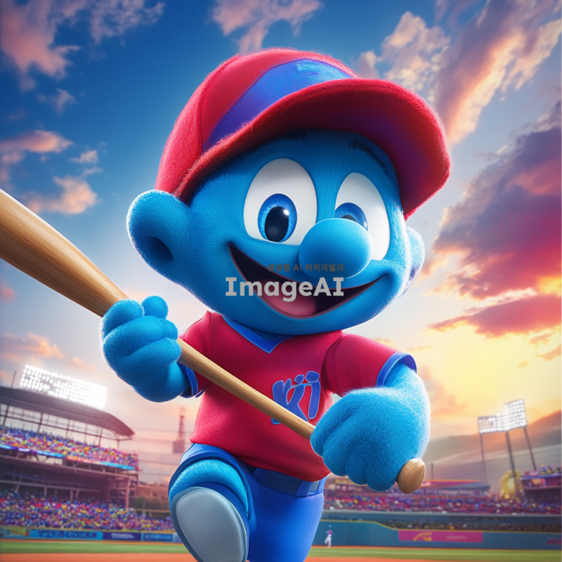 스머프 캐릭터가 기아타이거즈의 야구 유니폼을 입고 있는 모습, 밝고 생동감 있는 색상, 배경은 야구 경기장, 스머프는 웃고 있으며 손에 야구 방망이를 들고 있음.