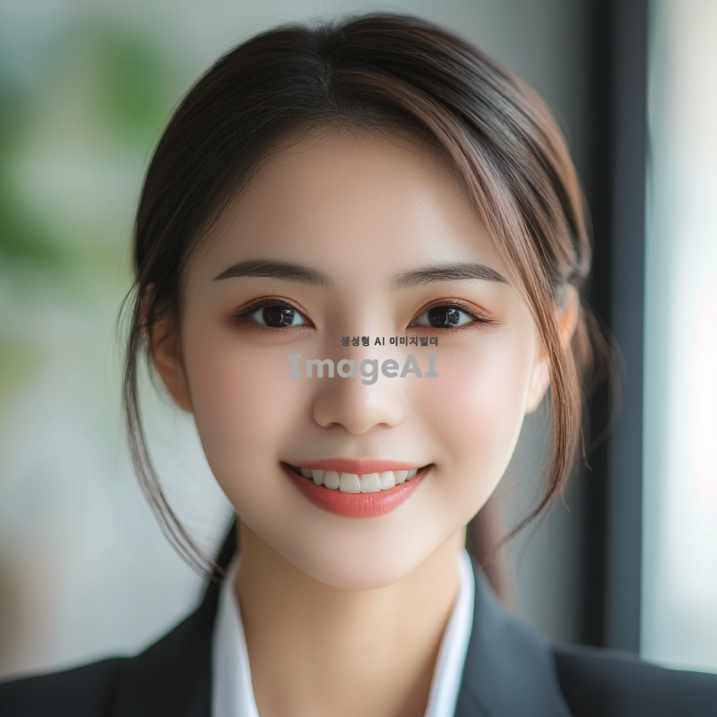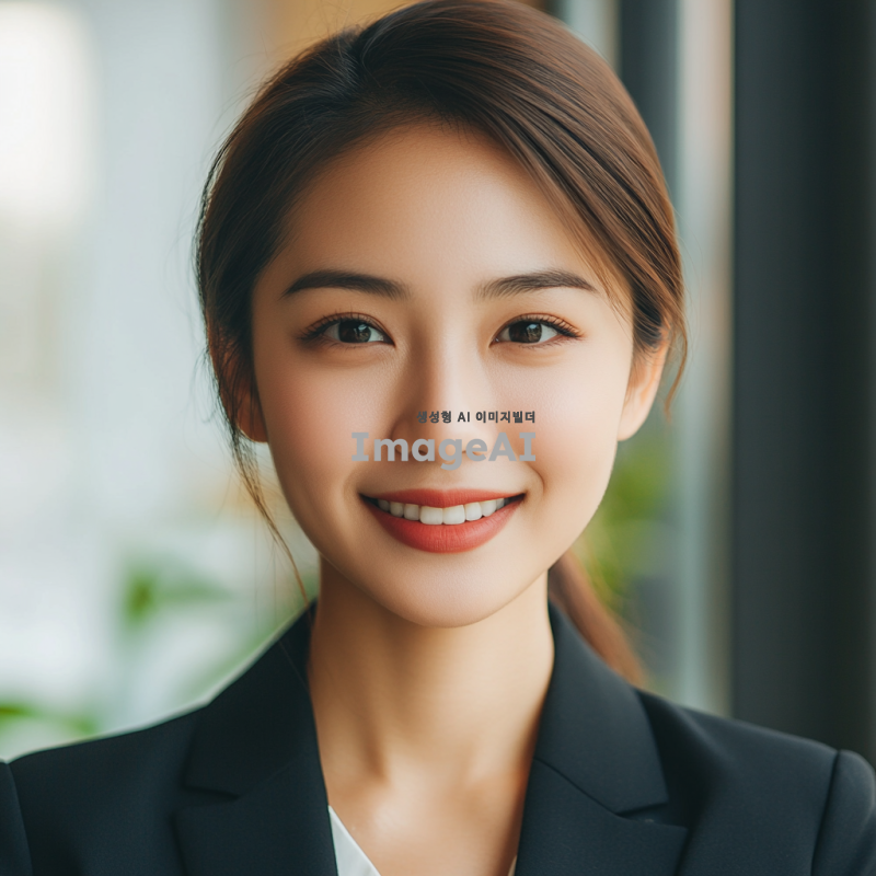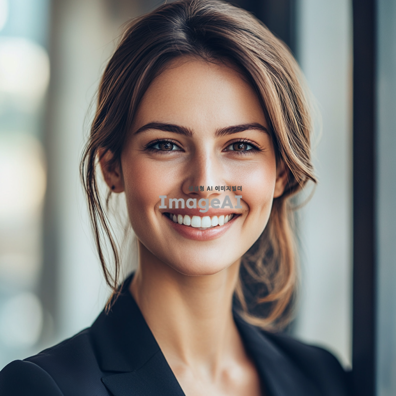 30대 여성 직장인의 증명사진, 신뢰감 있고 밝은 느낌, 단정한 정장 차림, 자연스러운 미소, 깔끔한 배경, 부드러운 조명, 세련된 헤어스타일, 자연스러운 메이크업.