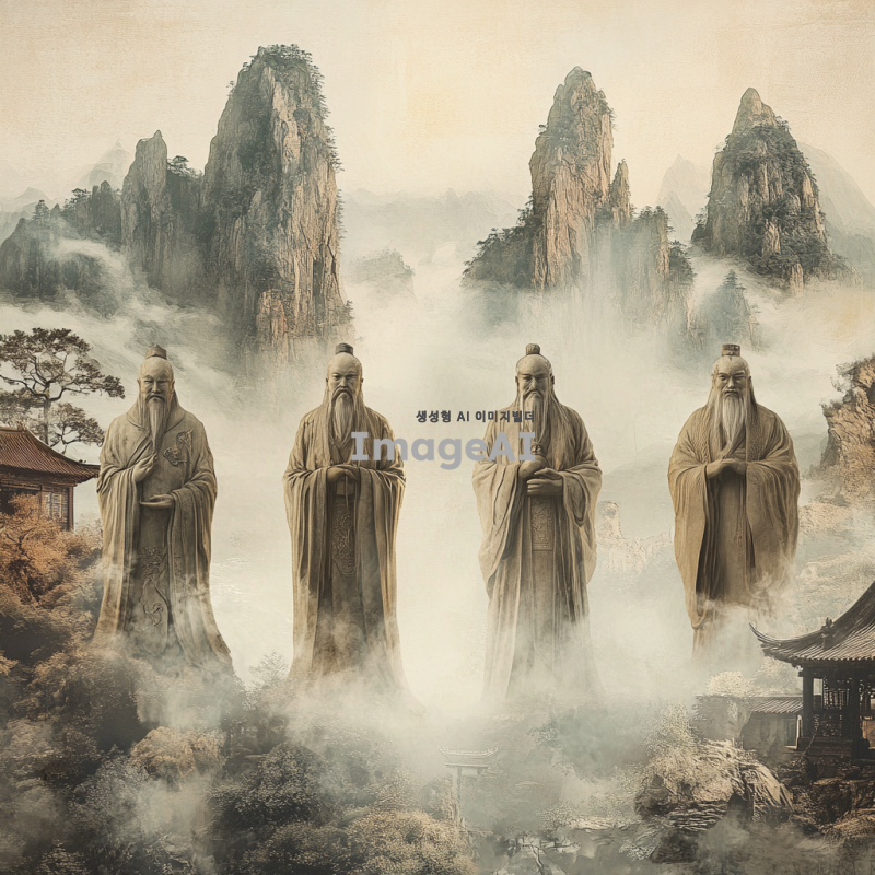 전통적인 동양의 사상과 철학을 반영한 이미지. 고대 중국의 풍경 속에서 네 명의 현자가 각기 다른 상징적인 자세와 표정으로 서 있는 장면. 첫 번째 현자는 인(仁)을 상징하며, 자비로운 미소와 따뜻한 눈빛을 가진 모습. 두 번째 현자는 의(義)를 상징하며, 결단력 있는 눈빛과 단호한 자세로 서 있는 모습. 세 번째 현자는 예(禮)를 상징하며, 품위 있는 자세와 정중한 표정으로 서 있는 모습. 네 번째 현자는 지(智)를 상징하며, 깊은 통찰력을 가진 눈빛과 차분한 자세로 서 있는 모습. 배경은 고대 중국의 자연경관과 전통 건축물들이 어우러져 있는 장면. 조화롭고 평화로운 분위기.