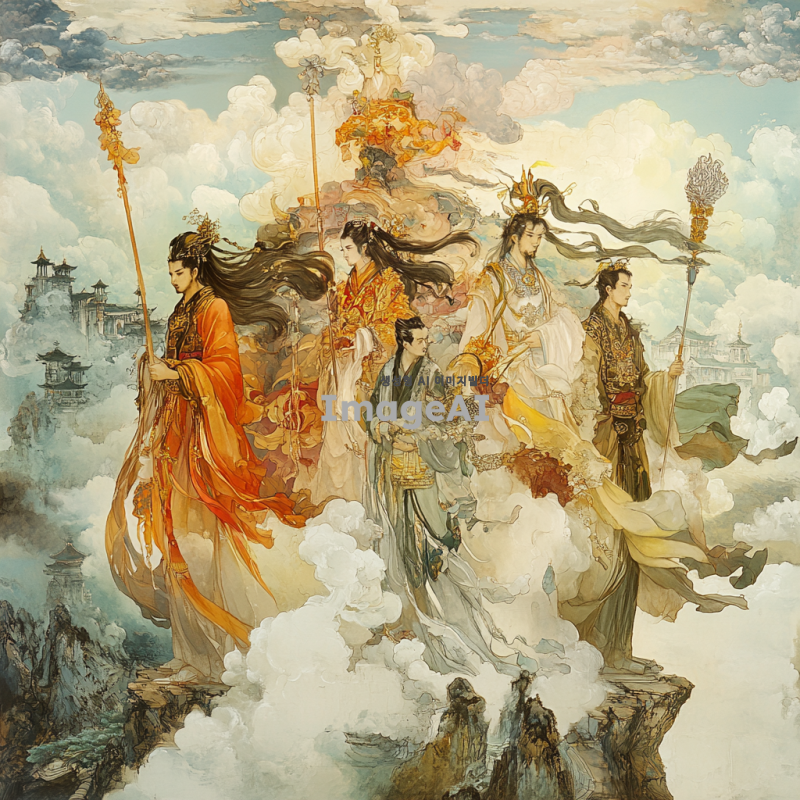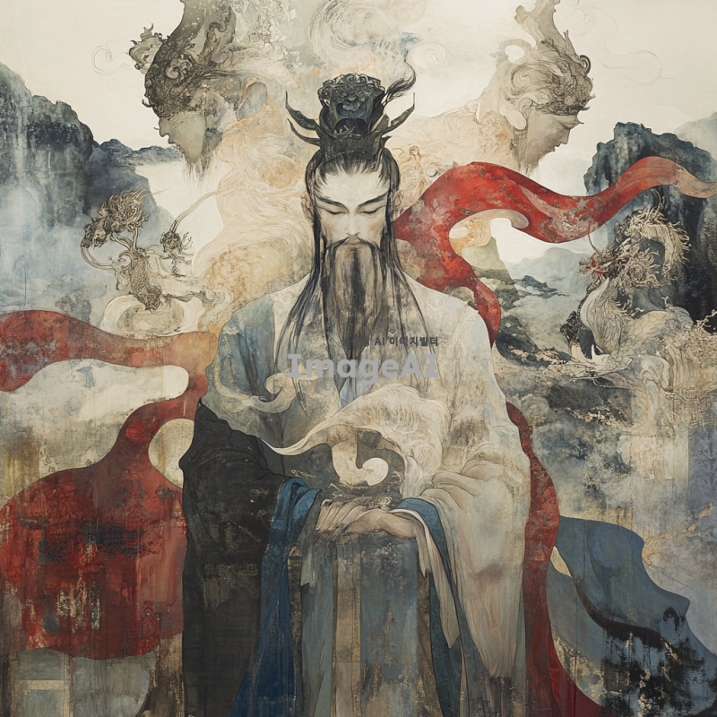 고대 중국의 철학적 개념인 인의예지신을 시각적으로 표현한 그림. 각 단어를 상징하는 요소들이 조화를 이루며, 전통적인 동양 예술 스타일로 표현됨. 인(仁)은 따뜻하고 포용적인 느낌의 인물, 의(義)는 정의롭고 강직한 전사, 예(禮)는 우아한 예법을 지키는 인물, 지(智)는 지혜롭고 사려 깊은 현자, 신(信)은 신뢰와 충실함을 나타내는 인물로 묘사됨. 배경은 고대 중국의 전통적인 풍경으로, 각 인물들이 자연스럽게 어우러져 있는 장면. 색감은 차분하고 조화롭게, 세밀한 붓질로 디테일을 살림.