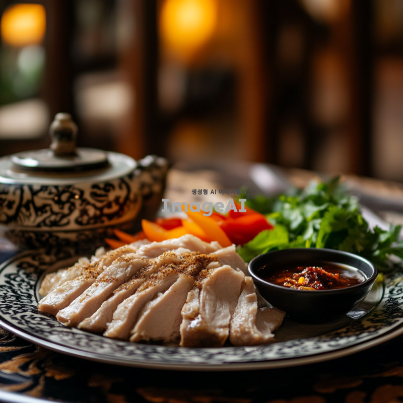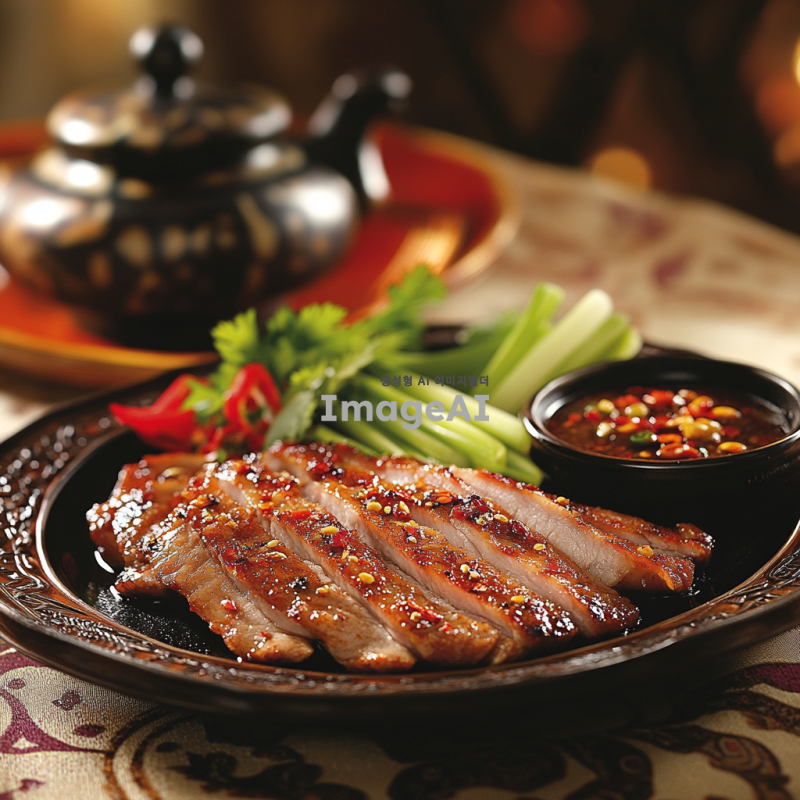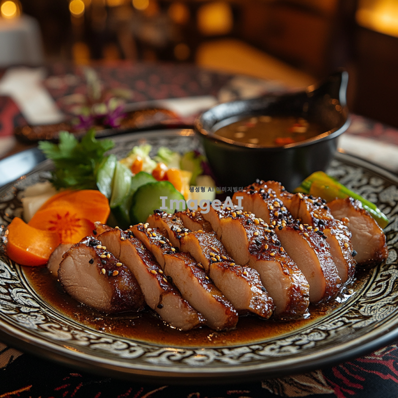 전통 중국 요리인 오향장육을 테이블 위에 정갈하게 놓인 모습으로, 돼지고기를 오향장육 방식으로 조리하여 얇게 썬 후 접시에 담긴 상태로 표현. 고기 위에는 향긋한 오향의 향신료가 뿌려져 있으며, 옆에는 신선한 채소와 함께 고소한 소스가 담긴 작은 그릇이 놓여 있음. 배경은 따뜻한 조명의 아늑한 식당 분위기, 중국 전통 문양이 새겨진 식탁보가 식탁을 덮고 있는 장면.