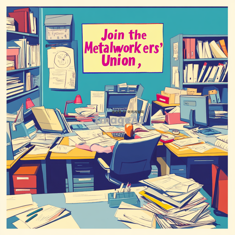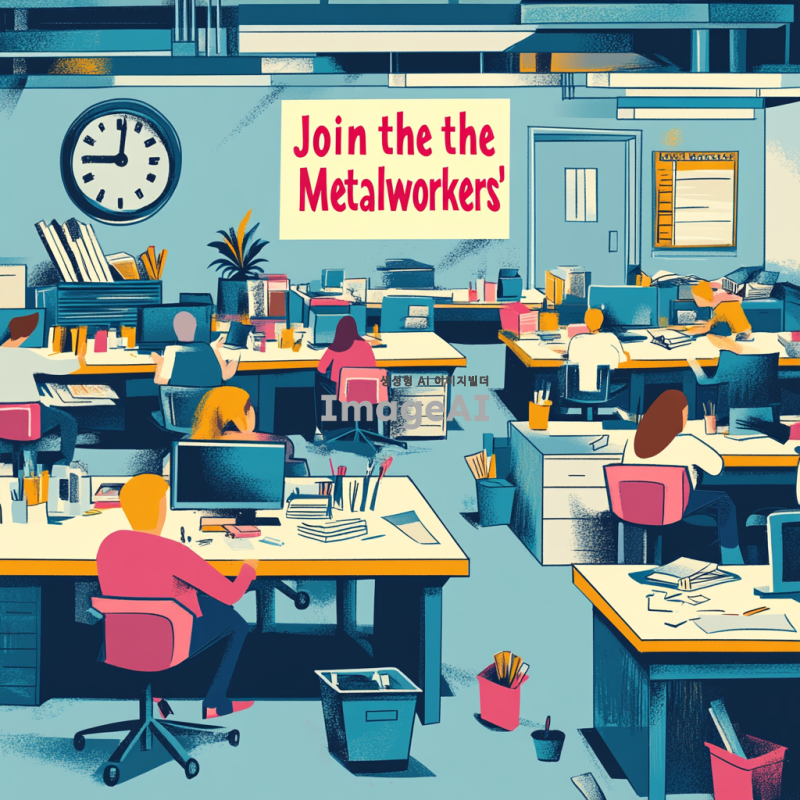 풍자적인 일러스트 스타일, 사무실 배경, 피곤한 표정의 직장인들이 책상에 앉아 있는 모습, 책상 위에는 서류 더미와 컴퓨터, 벽에는 시계가 걸려 있으며 시간이 느리게 가는 듯한 느낌, 한쪽 구석에는 금속노조 가입을 독려하는 포스터가 붙어 있음, 포스터에는 생생한 색상과 강렬한 글씨체로 "금속노조 가입" 문구, 전체적으로 약간의 유머와 풍자가 느껴지는 분위기.