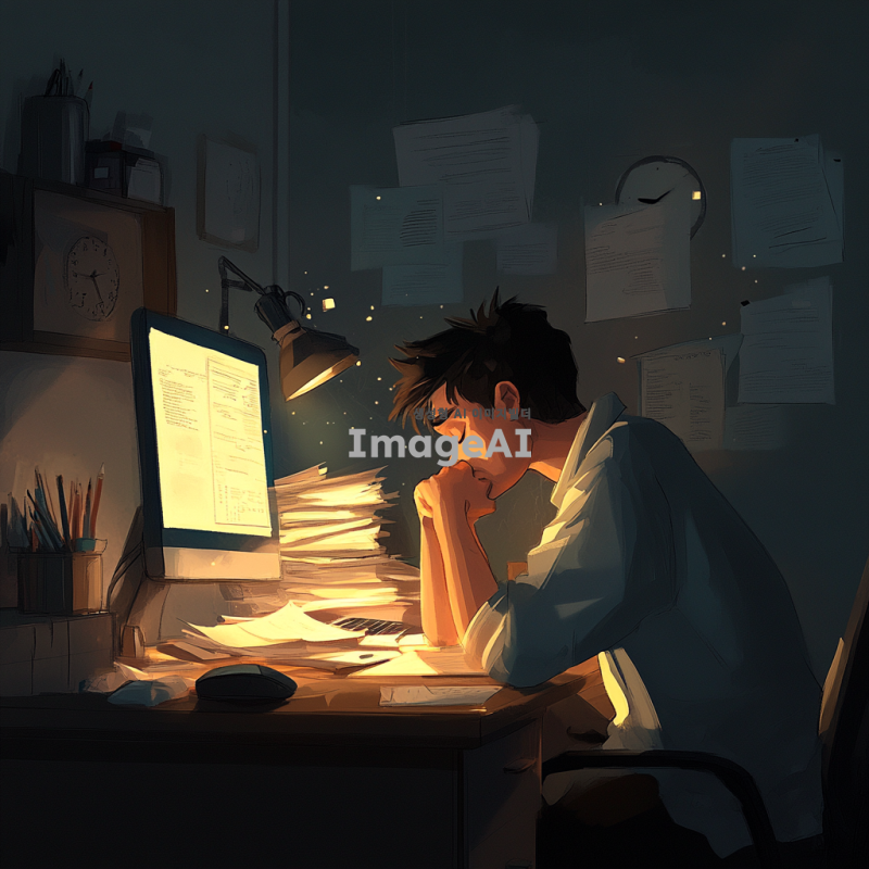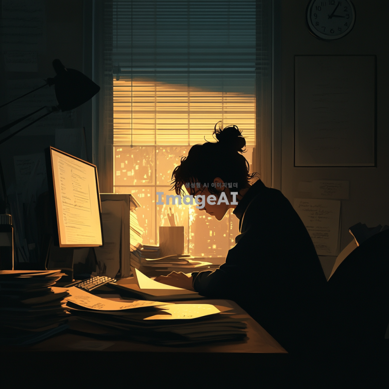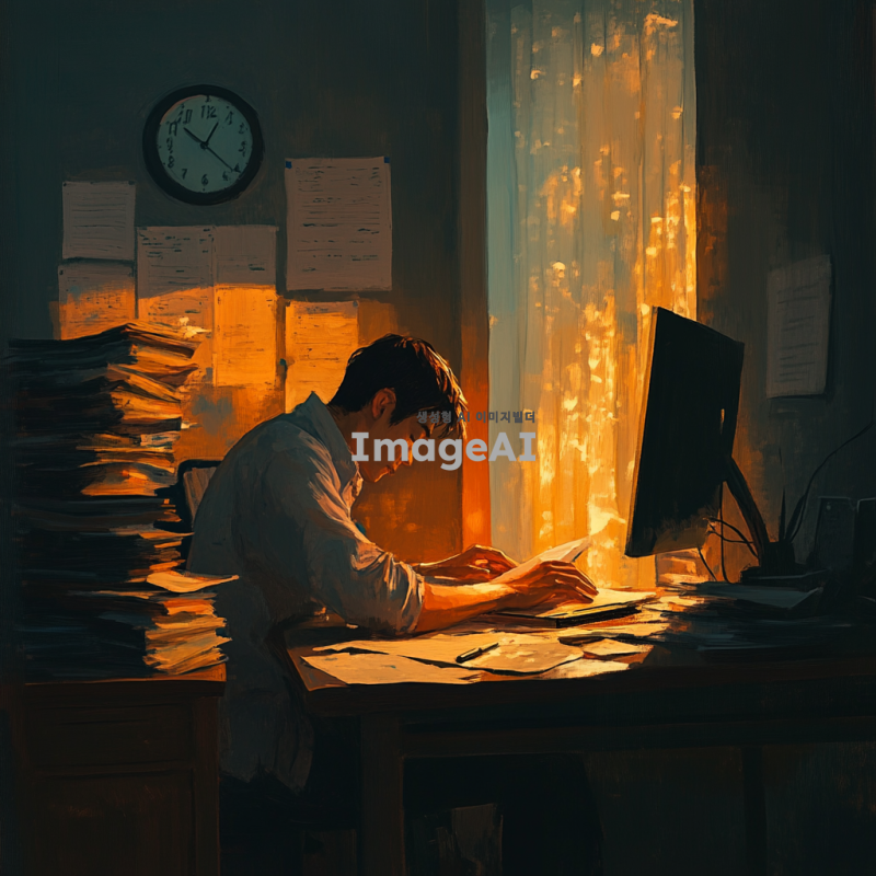 장시간 노동에 지친 사람이 책상에 앉아 있는 모습, 희미한 조명 아래에서 피곤한 표정을 짓고 있음. 주변에 쌓인 서류와 컴퓨터 화면에 빛이 반사되어 피곤함을 강조. 작은 창문으로 들어오는 약간의 햇빛이 방 안을 비추고, 시계는 늦은 시간을 가리키고 있음.