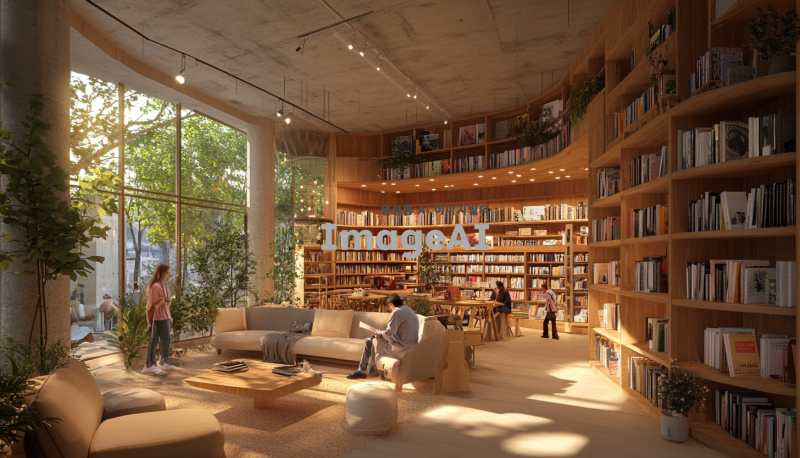 아늑하고 따뜻한 분위기의 책방, 나무 책장이 가득한 실내, 편안한 소파와 안락의자, 부드러운 조명 아래 다양한 장르의 책들이 진열된 모습, 창문을 통해 들어오는 자연광, 독서에 몰두하는 사람들, 차와 커피를 즐길 수 있는 작은 카페 코너, 벽에는 예술적인 포스터와 식물들이 장식된 장면.