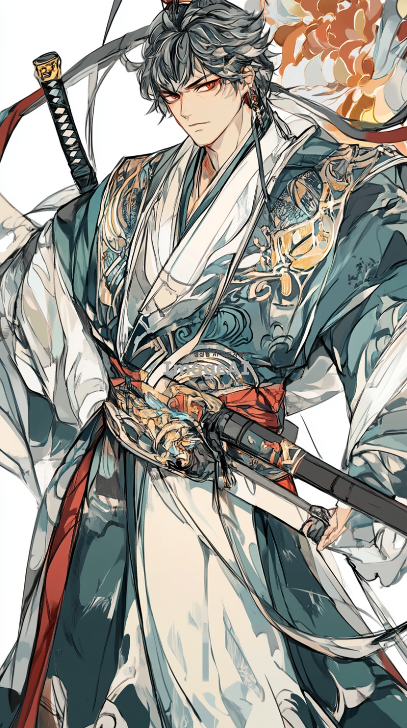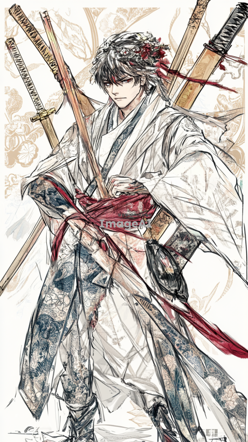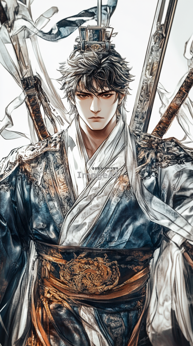 중국 전통 의상을 입고 있는 무사, 등에 검, 도, 창, 봉과 같은 다양한 무기를 메고 있는 모습, 복잡한 자수와 디테일이 돋보이는 옷차림, 전통적인 중국 배경, 강렬하고 결의에 찬 표정, 동양적인 미적 요소가 강조된 이미지, 역사적이고 문화적인 분위기.