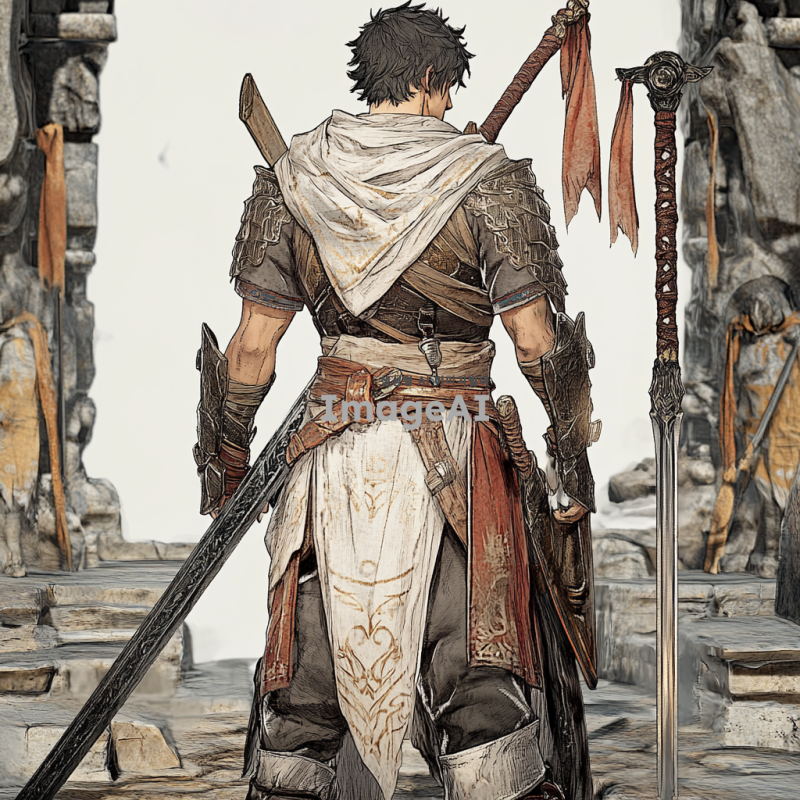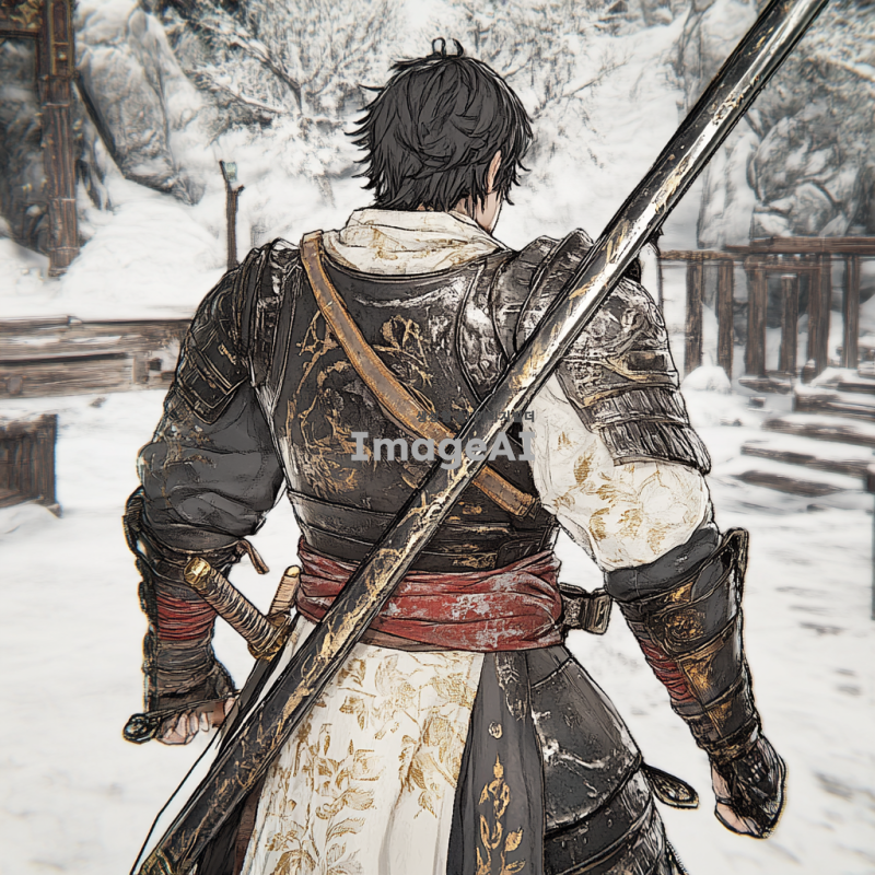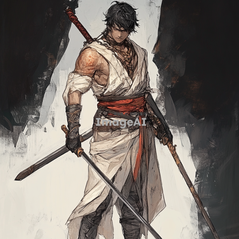 참조 이미지 거의 그대로 등에 창, 도, 봉 등을 메고 있는 걸로만 변경