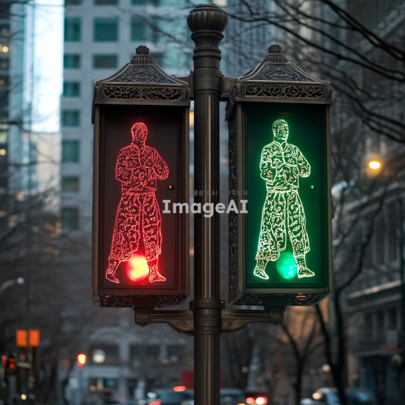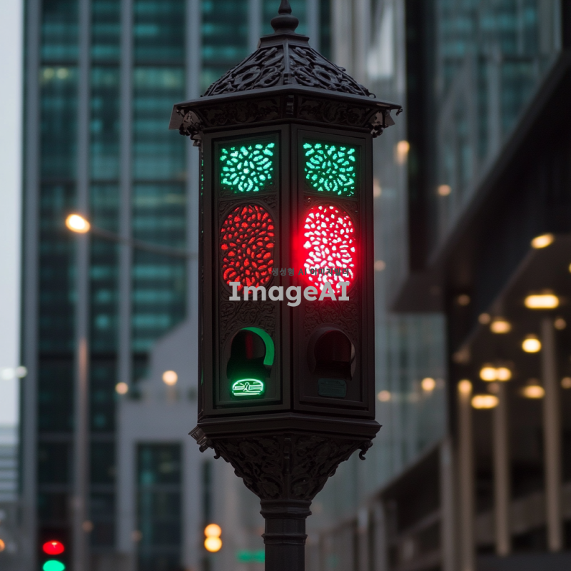 전통적인 등롱 형태를 가진 보행자 신호등, 동양의 고전적인 디자인 요소를 포함하며, 붉은색과 녹색의 조명을 사용하여 행인에게 신호를 주는 모습, 정교한 세부 장식과 금속 프레임, 주변에는 현대적인 도시 풍경이 배경으로 어우러짐.