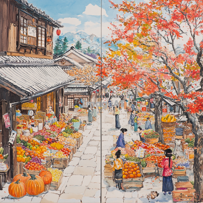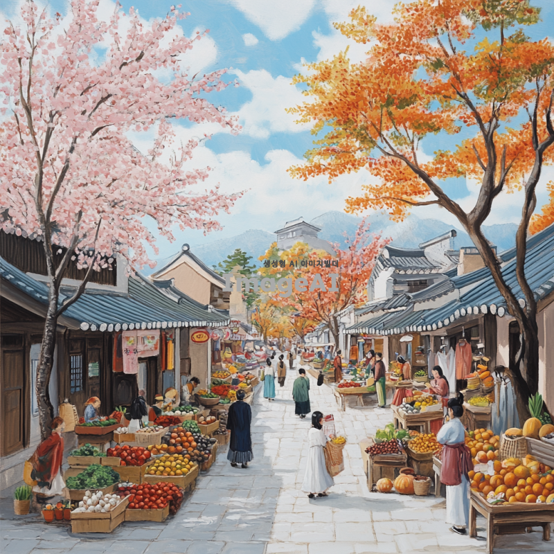 현대적인 요소와 전통적인 요소가 조화를 이루는 시장의 모습을 사계절로 표현한 그림. 봄에는 벚꽃이 만개한 시장 거리, 여름에는 푸른 하늘 아래 다양한 여름 과일과 채소가 가득한 시장, 가을에는 단풍이 물든 나무들 사이로 호박과 고구마 등 가을 수확물이 진열된 시장, 겨울에는 눈이 소복이 쌓인 시장 거리와 따뜻한 음료와 겨울 간식이 있는 모습. 현대적인 건축물과 전통적인 건축물이 어우러진 배경, 사람들은 전통 의상과 현대 의상을 혼합하여 입고 있다. 조화로운 색감과 계절의 변화를 강조한 따뜻한 분위기.