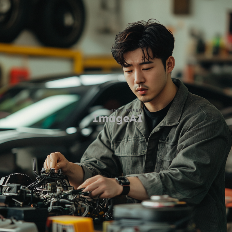 20대 한국 남자가 자동차 개조 작업을 하는 장면, 작업복을 입고 자동차 엔진을 다루는 모습, 현대적인 작업 공간, 다양한 공구와 자동차 부품이 주변에 놓여 있는 모습, 집중하여 작업하는 젊은 남자의 표정, 자동차 개조에 대한 열정이 느껴지는 분위기. 그리고 배경에 스포츠카가 보임