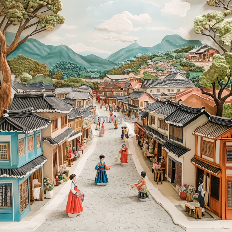안동 시장의 메인 스트릿을 배경으로, 전통적인 건축 양식과 현대적인 디자인이 조화를 이루는 모습을 그린다. 거리에 전통놀이를 즐기는 사람들의 모습을 담고, 곳곳에 사진을 찍기 좋은 포토존을 배치한다. 시장의 활기찬 분위기와 다양한 상점들이 늘어서 있는 모습을 표현하고, 전통적인 한복을 입은 사람들이 현대적인 건물 앞에서 전통놀이를 하는 장면을 포함한다. 포토존은 전통적인 장식 요소와 현대적인 디자인이 어우러진 형태로, 방문객들이 사진을 찍으며 즐길 수 있는 공간으로 설정한다.