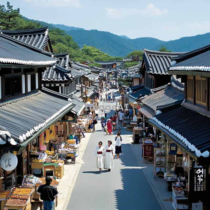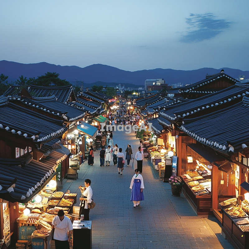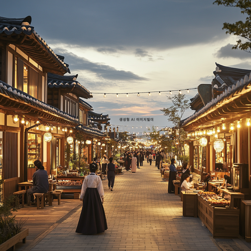 안동시장의 메인스트릿, 전통 한옥 양식의 건물과 현대적인 건축물이 어우러진 거리, 거리 양옆으로는 다양한 상점들이 늘어서 있고, 전통 한복을 입은 사람들이 거리를 거닐고 있는 모습, 거리 한쪽에는 바베큐 존이 마련되어 있어 사람들이 맛있는 음식을 즐기고 있는 장면, 전통과 현대가 조화를 이루는 활기찬 분위기, 따뜻한 색감과 조명이 어우러진 풍경.