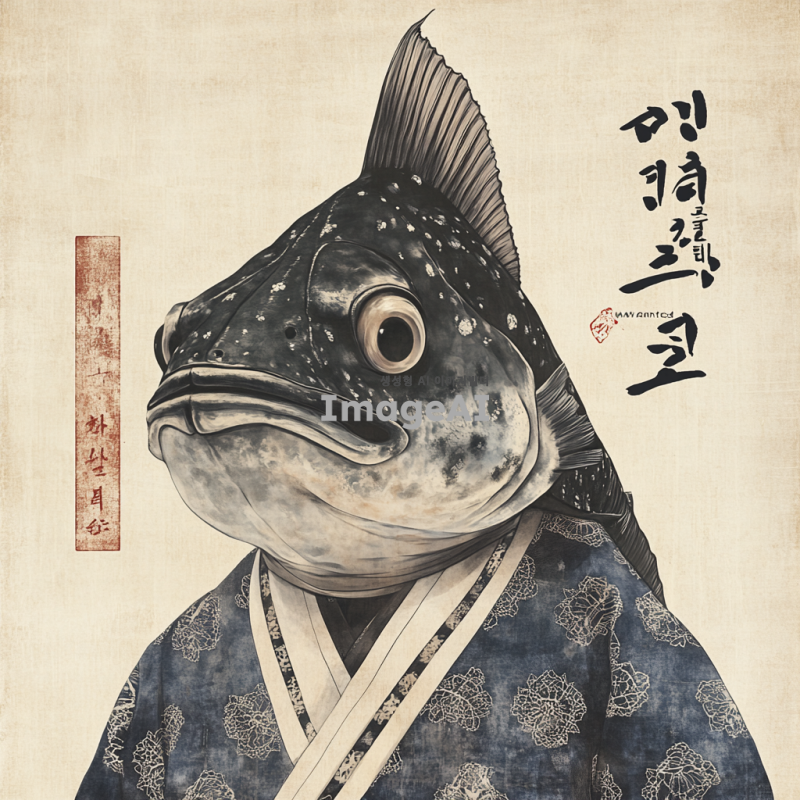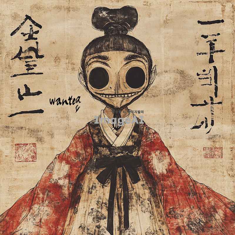 조선시대 스타일의 현상수배지, 고등어와 인간의 특징을 결합한 형상, 전통 한복을 입고 있는 모습, 고풍스러운 한지 배경, 수묵화 느낌의 세부 묘사, 얼굴은 고등어의 특징을 가지고 있으며, 몸은 인간의 형태, 조선시대의 전통적인 서체로 "현상수배"라는 문구 포함, 역사적이고 신비로운 분위기.