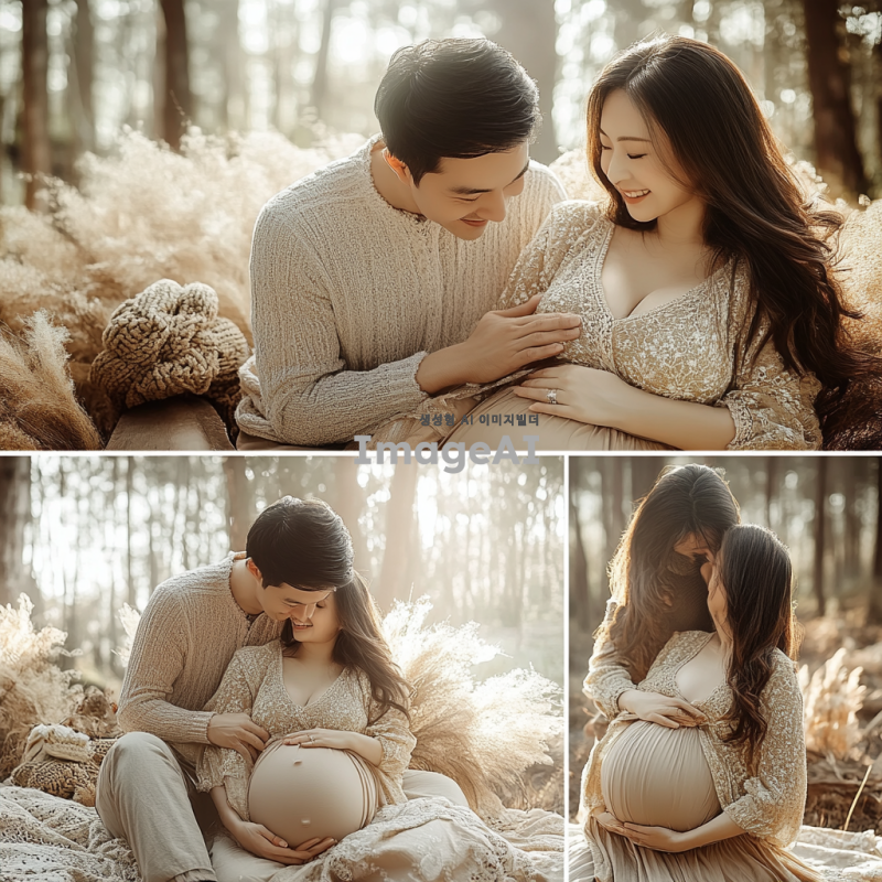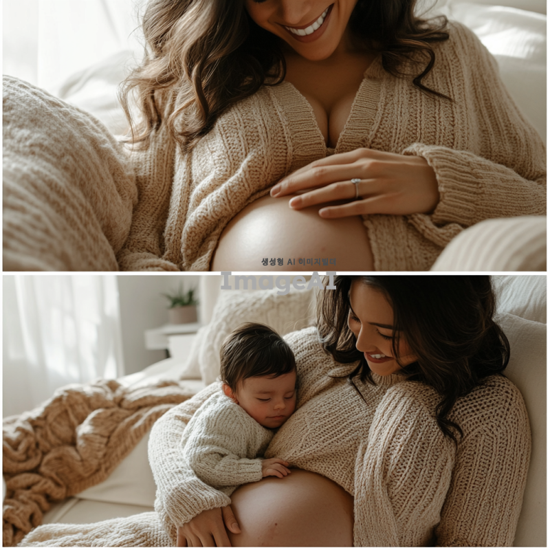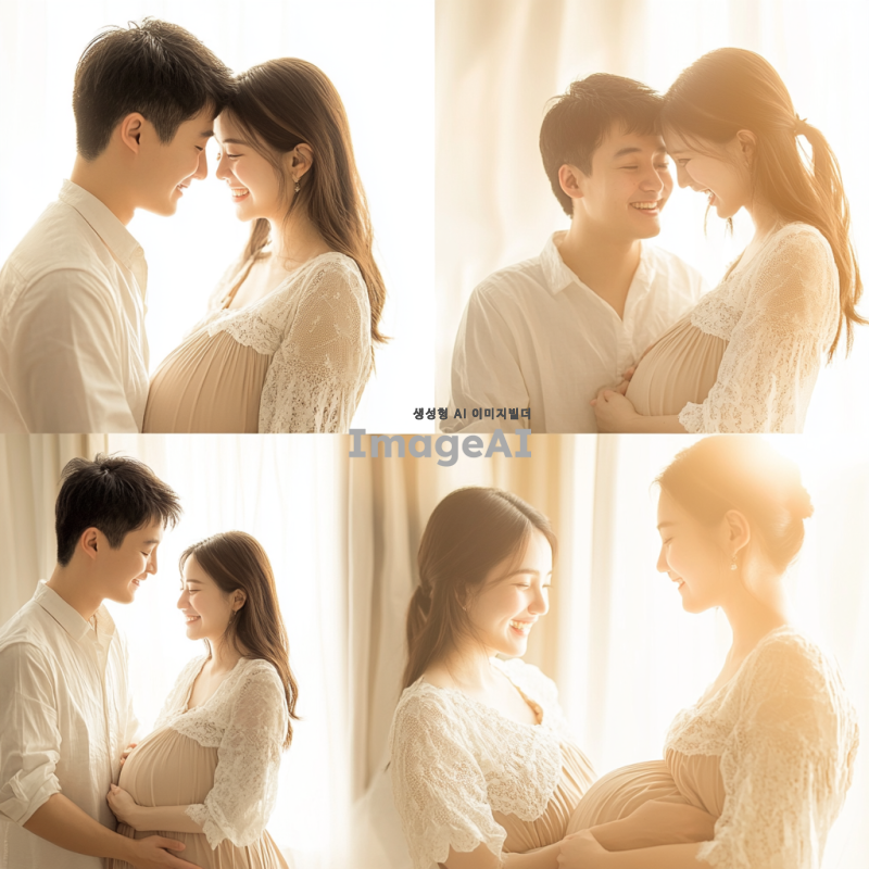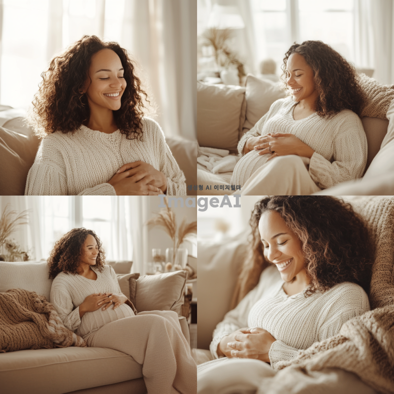 따뜻하고 사랑스러운 분위기의 임산부 캐릭터, 다양한 인종과 스타일, 부드러운 색조, 편안한 옷차림, 행복한 미소, 자연스러운 배경, 다양한 임신 주수를 표현, 각기 다른 포즈와 각도, 현대적이고 친근한 느낌, 가족과 함께 있는 모습, 건강하고 활기찬 분위기.