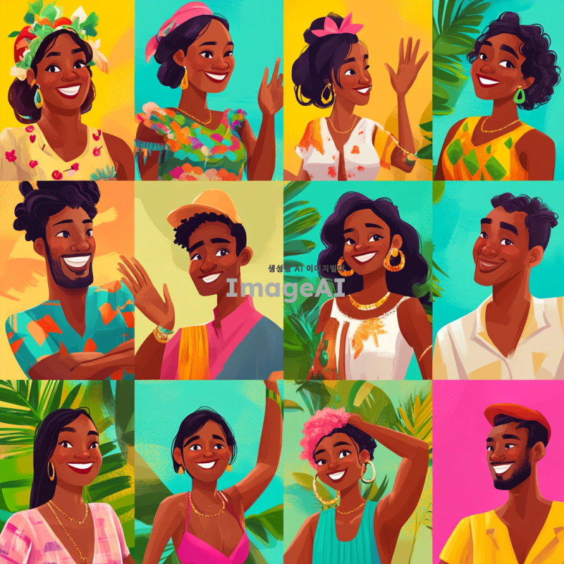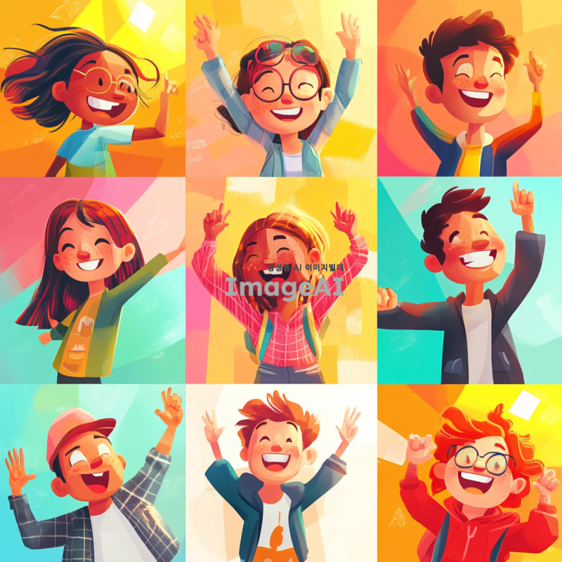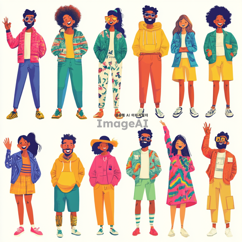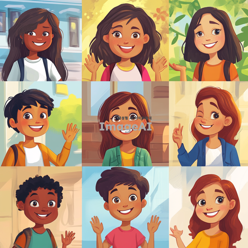 만화 스타일, 손을 흔들며 미소 짓고 있는 여러 사람, 밝고 친근한 분위기, 다양한 배경과 의상, 생동감 있는 색상과 표현, 다양한 연령대와 성별 포함