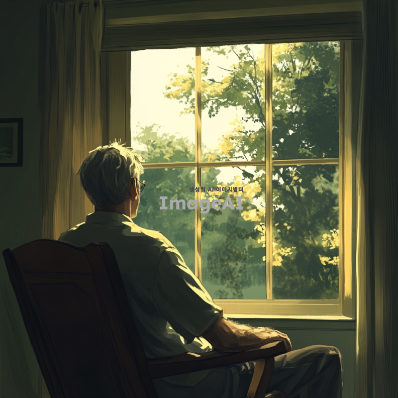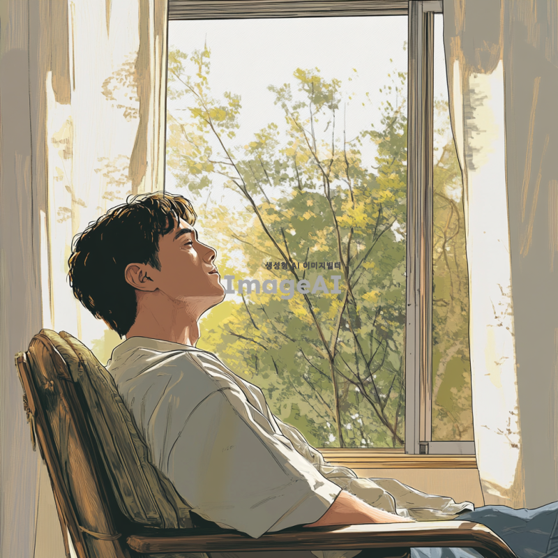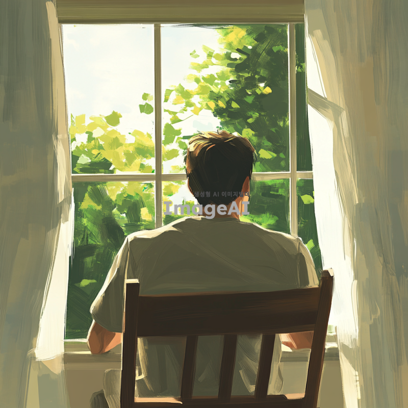 창밖을 바라보는 남자의 모습을 그려줘. 그는 편안한 의자에 앉아 있으며, 창문 밖으로는 맑은 하늘과 푸른 나무들이 보인다. 남자는 캐주얼한 셔츠를 입고 있으며, 얼굴에는 평화롭고 사색적인 표정이 담겨 있다. 창문을 통해 따스한 햇살이 들어와 방 안을 밝게 비추고 있다. 전체적인 분위기는 차분하고 고요하며, 자연과 조화를 이루는 느낌이다.