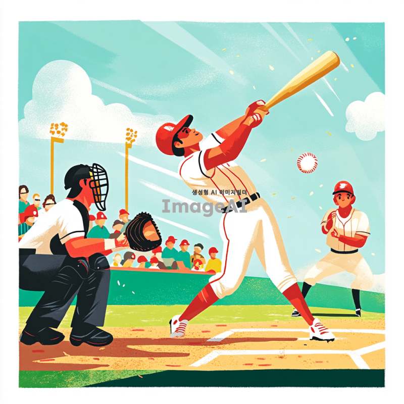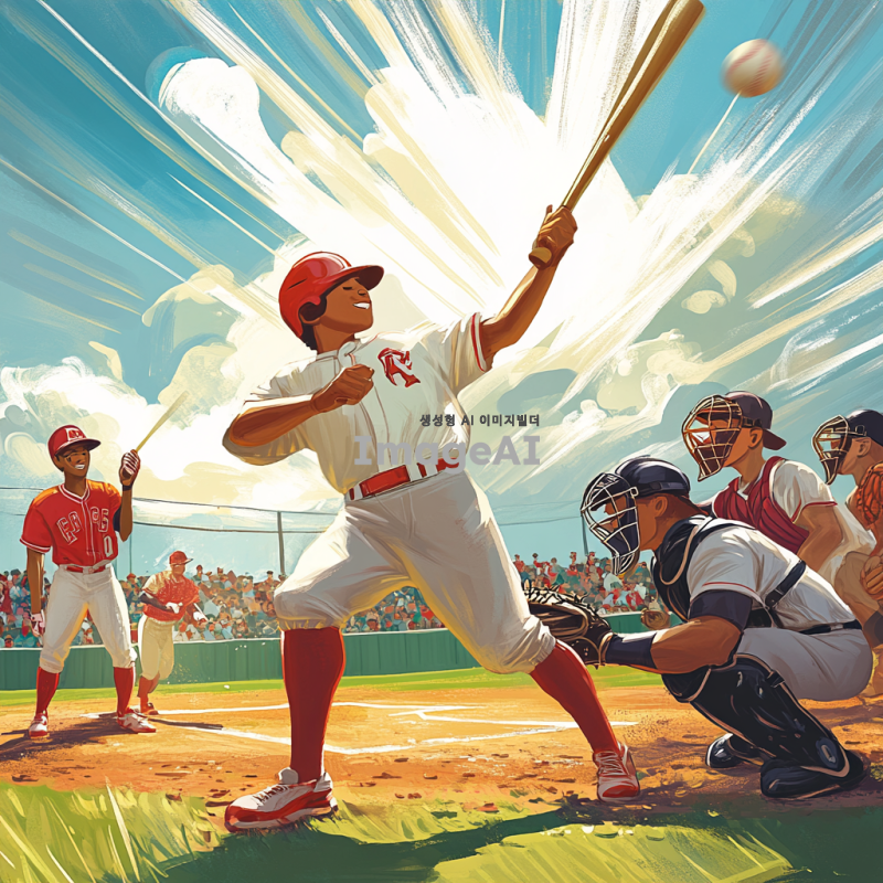 야구 경기 중인 선수들, 역동적인 동작, 빠르게 날아가는 야구공, 푸른 잔디와 흙으로 된 경기장, 관중석에 있는 사람들, 햇빛이 비치는 맑은 날씨, 팀 유니폼을 입은 선수들, 집중하는 표정, 공을 던지는 투수와 공을 치는 타자, 역동적인 움직임과 에너지 넘치는 장면.