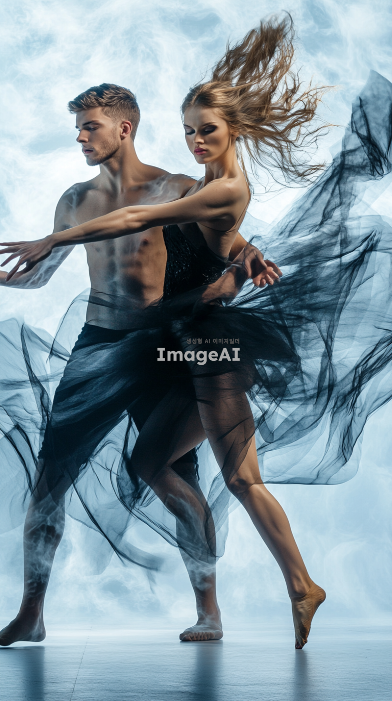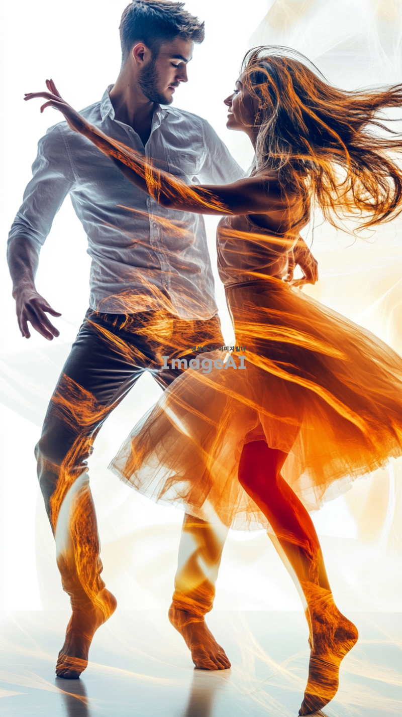 젊은 남녀가 현대 무용을 추는 모습, 두 사람의 역동적인 움직임과 표정이 강조된 장면, 남자는 짧은 머리와 캐주얼한 옷차림, 여자는 긴 머리와 우아한 드레스를 입고 있으며, 배경은 투명하게 설정, 춤의 에너지가 느껴지는 생동감 있는 포즈와 조명 효과.