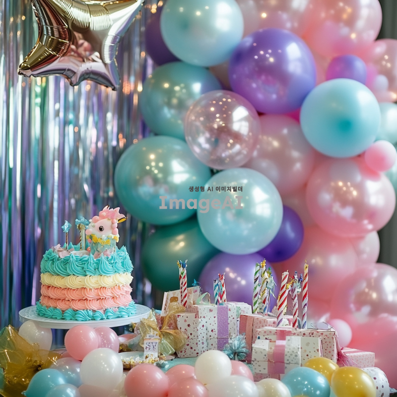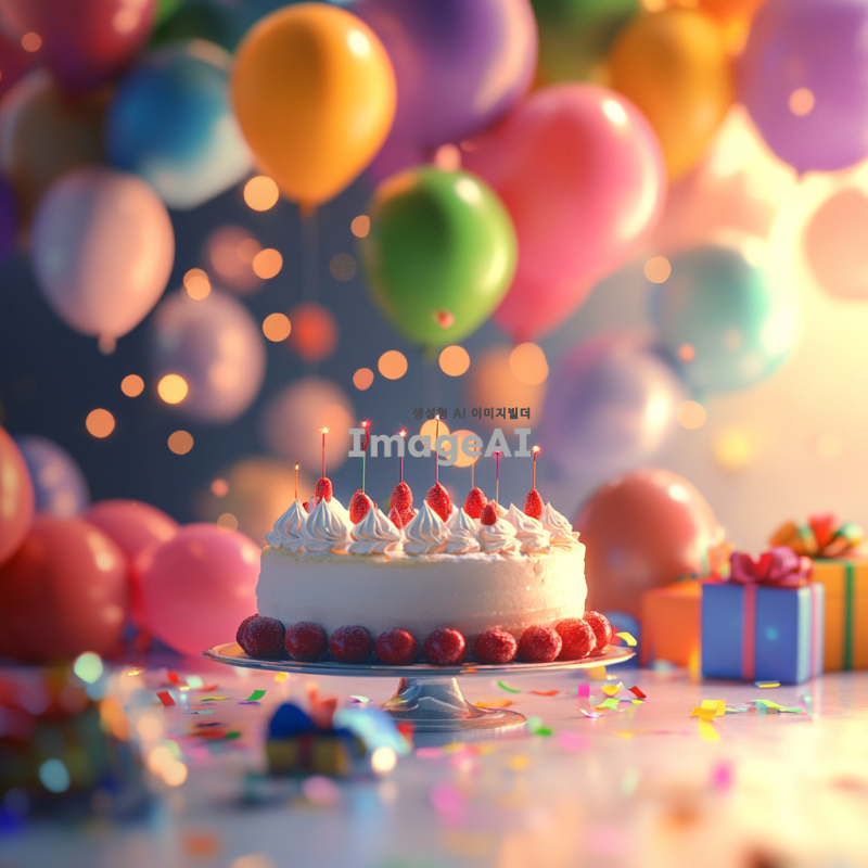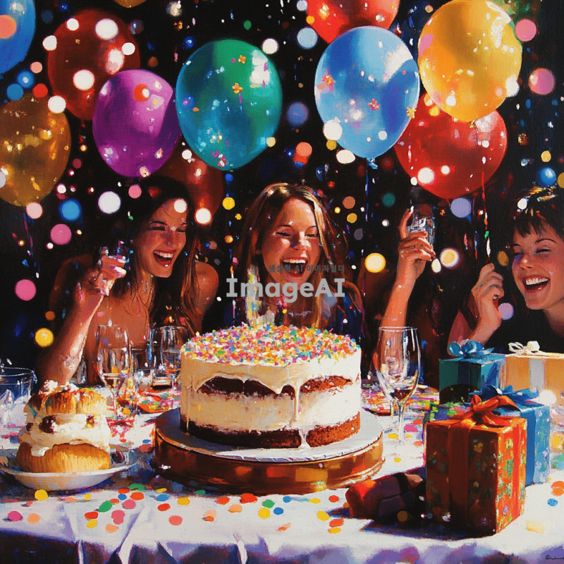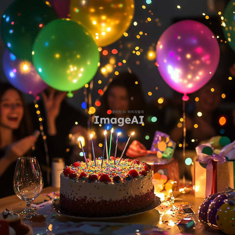 밝고 화사한 축하 분위기의 파티 장면, 다양한 색상의 풍선과 반짝이는 조명, 테이블 위에 놓인 맛있는 케이크와 선물들, 사람들이 웃으며 즐거워하는 모습, 화려한 배경과 함께 행복한 순간을 포착한 이미지.