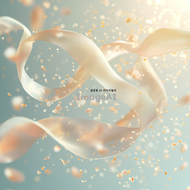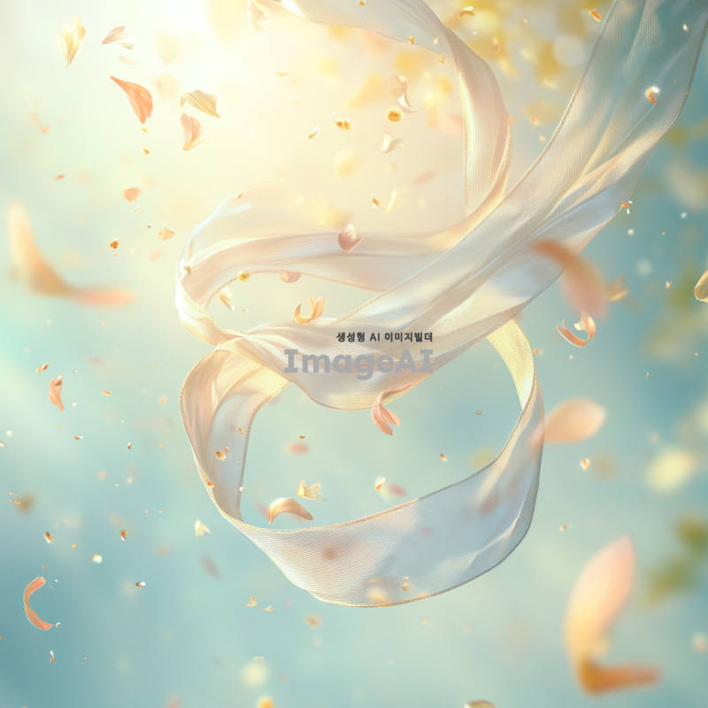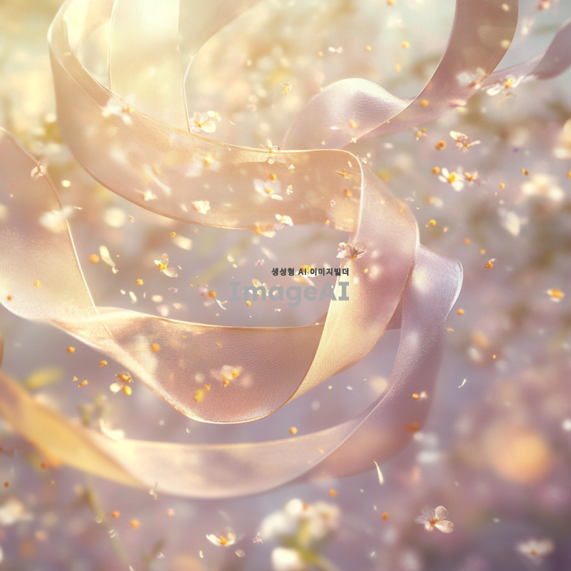봄바람에 흩날리는 꽃가루와 함께 공중에 떠오르는 우아한 리본, 부드러운 파스텔톤 배경, 따뜻한 햇살이 비치는 장면, 리본의 섬세한 움직임과 꽃가루의 자연스러운 흐름, 평화롭고 꿈같은 분위기.