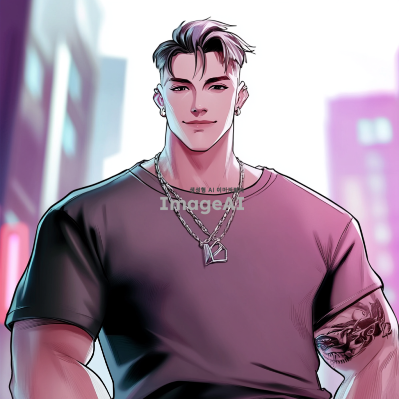 강렬한 표정과 근육질의 몸을 가진 남성 캐릭터, 짧은 헤어스타일과 날카로운 눈매, 강한 턱선과 매력적인 미소를 강조, 현대적인 스트리트 패션을 입고 있으며, 배경은 도시의 밤 풍경으로 네온사인이 빛나는 거리, 캐릭터의 자신감과 카리스마가 돋보이는 모습.