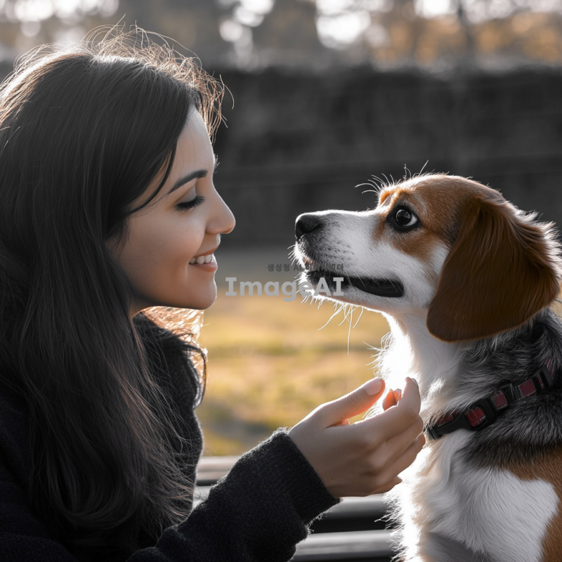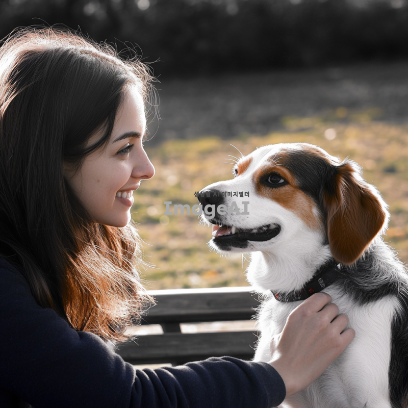 따뜻한 미소를 짓고 있는 여성과 그녀의 반려견이 서로를 바라보고 있는 장면, 여성은 긴 머리를 가지고 있으며 캐주얼한 옷차림, 반려견은 중형견으로 털이 부드럽고 눈이 반짝임, 배경은 햇살이 비치는 공원 벤치, 두 사이에 흐르는 친밀한 분위기와 사랑스러운 감정이 강조됨.