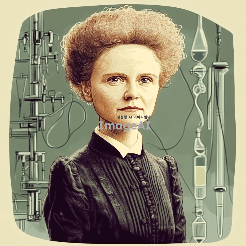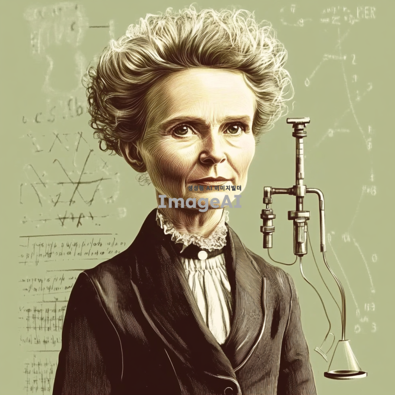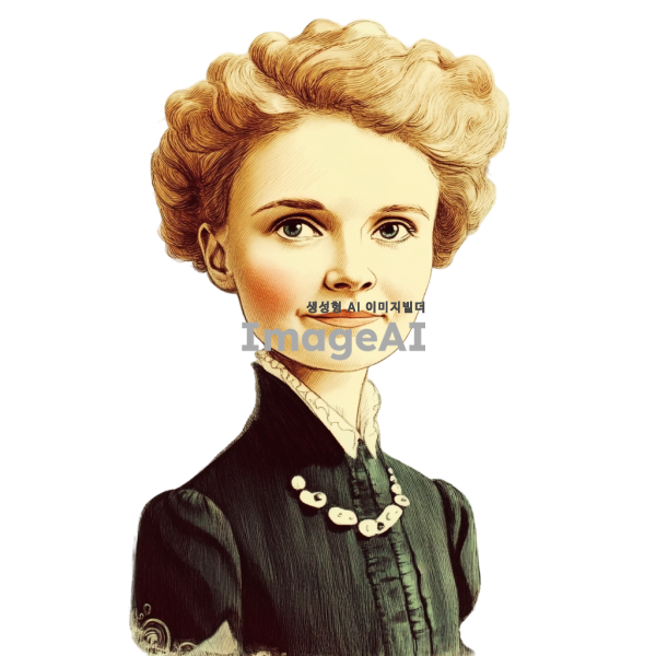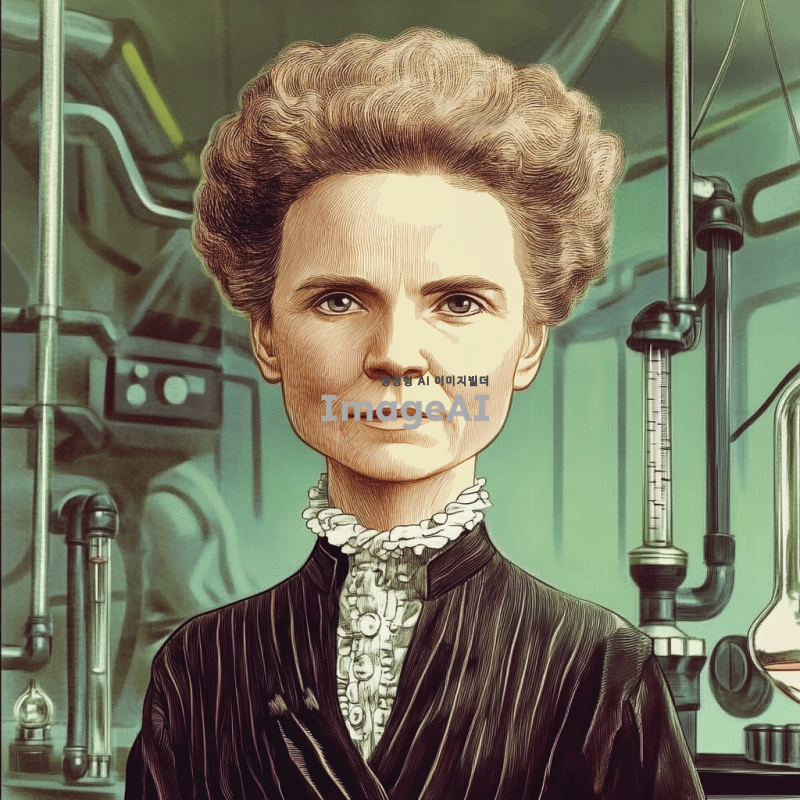 20세기 초 마리 퀴리의 인물 사진을 기반으로, 그녀의 특징을 강조한 선으로 표현된 캐리커처. 과학자 특유의 지적이고 탐구적인 분위기를 유지하면서도, 그녀의 상징적인 실험실 가운과 화학 기구를 함께 묘사하여 경쾌하고 유머러스한 느낌을 살린 이미지.