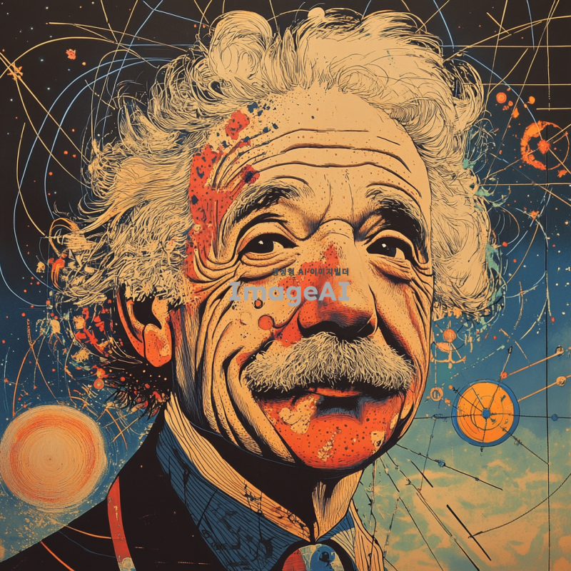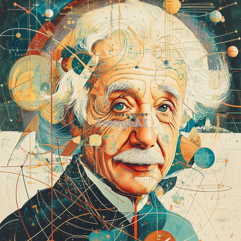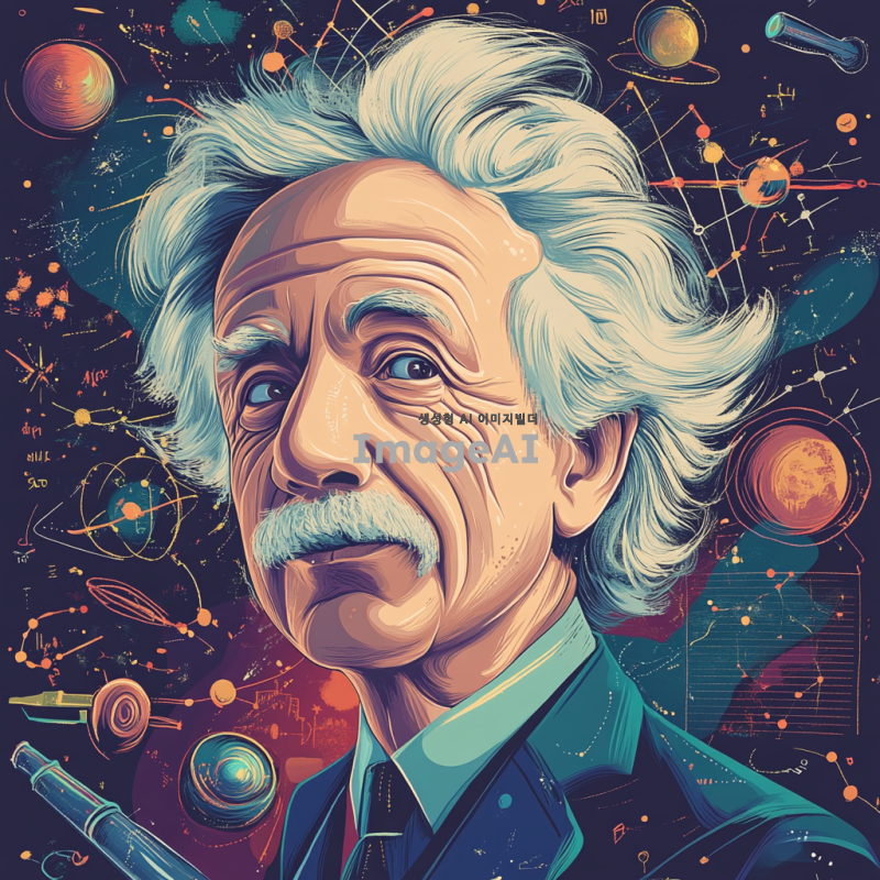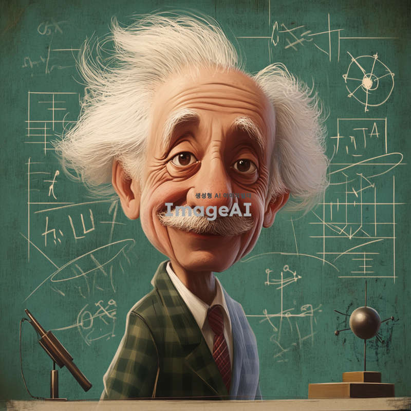 아인슈타인의 인물 사진을 기반으로, 그의 특징적인 얼굴과 헤어스타일을 강조한 선으로 표현된 캐리커처. 지적인 표정과 탐구적인 분위기를 유지하며, 배경에는 상대성 이론을 상징하는 수학 공식과 우주 이미지가 어우러져 있는 장면. 과학적 도구나 원자 모형이 함께 배치되어 있으며, 경쾌하고 유머러스한 느낌을 주는 밝은 색조의 이미지.