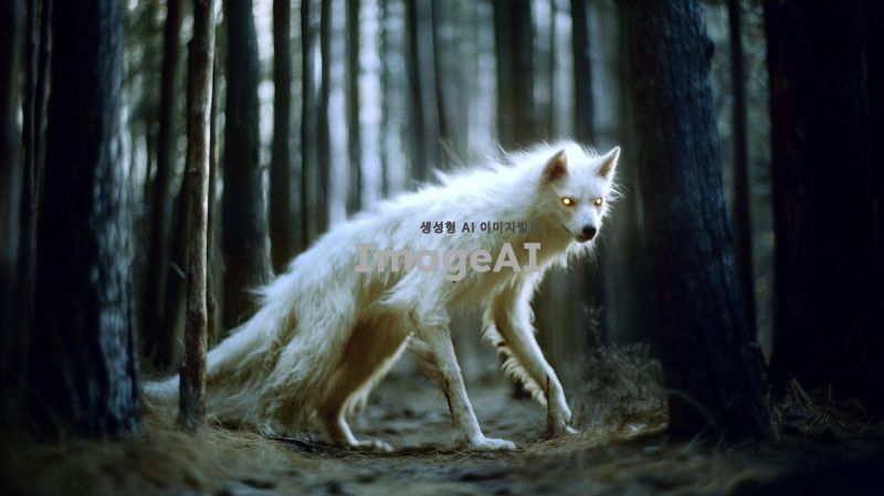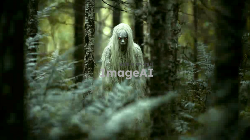 한국 전통 요괴 장산범, 어두운 숲 속에서 신비로운 분위기, 긴 흰 털과 빛나는 눈, 뒤를 돌아보는 자세, 공포스러운 얼굴,