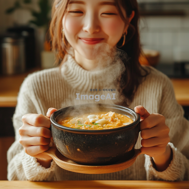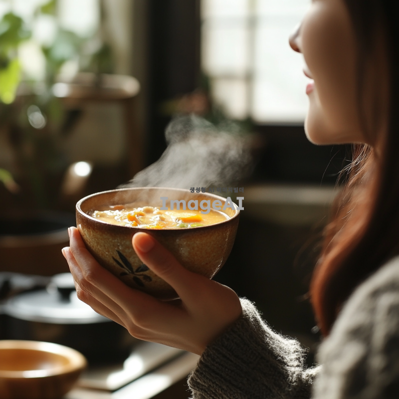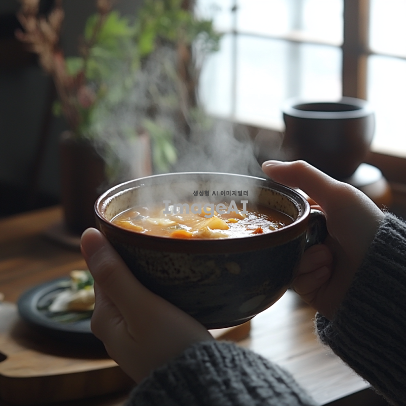 따뜻한 된장찌개가 담긴 컵을 들고 있는 사람, 향긋한 김이 올라오고 있으며, 사람은 행복한 표정으로 컵을 입에 가까이 대고 있다, 전통적인 한국 가정의 주방 배경, 자연스럽고 편안한 분위기, 컵은 전통적인 한국 도자기 스타일, 된장찌개의 풍부한 색감과 질감이 잘 드러나도록.