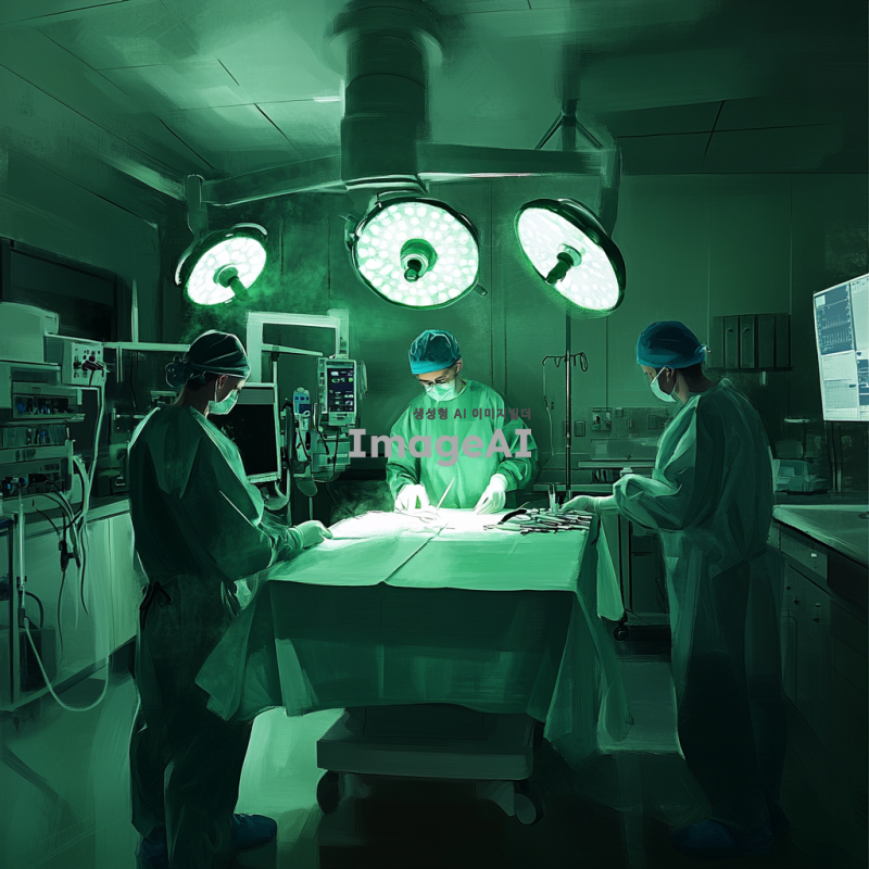 의사들이 수술실에서 집중하며 협력하는 모습, 그린 톤의 조명과 장비들이 어우러진 장면, 세밀한 수술 도구와 의료진의 섬세한 손길, 차분하고 전문적인 분위기, 의료복과 장갑의 질감, 수술실의 청결한 환경과 첨단 의료기기 배경.