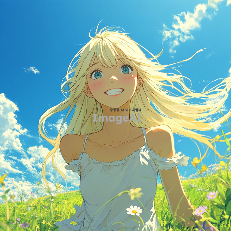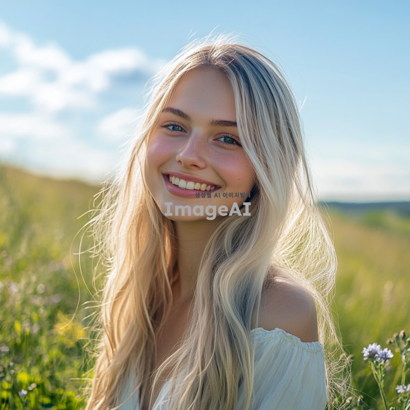 밝은 햇살 아래에서 해맑게 웃고 있는 금발의 외국 여자 아이, 자연스럽게 흩날리는 긴 머리, 푸른 하늘을 배경으로 한 초록색 들판에 서 있는 모습, 건강하고 활기찬 분위기, 따뜻한 햇빛이 아이의 얼굴을 부드럽게 비추는 장면, 아이의 눈은 반짝이고 입가에는 환한 미소, 주변에는 야생화가 살짝 피어 있는 장면.
