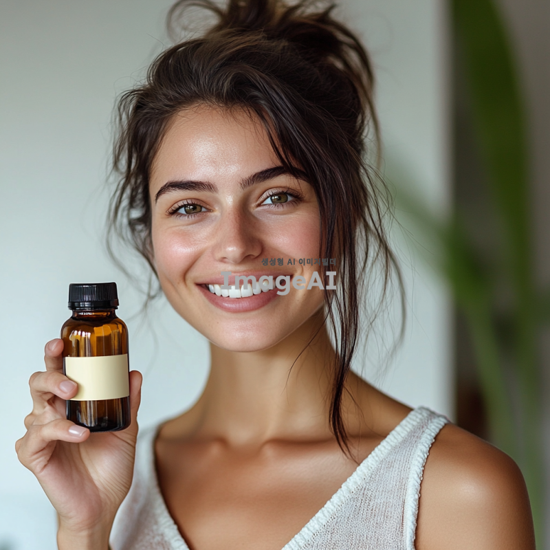 밝은 미소를 짓고 있는 젊은 외국 여성, 건강하고 활기찬 분위기, 자연광이 비치는 실내에서 촬영, 손에 영양제 병을 들고 있는 모습, 깨끗하고 깔끔한 배경, 건강과 웰빙을 연상시키는 요소들 포함, 따뜻하고 친근한 색감, 신뢰감을 주는 눈빛과 표정, 현대적이고 세련된 스타일링.