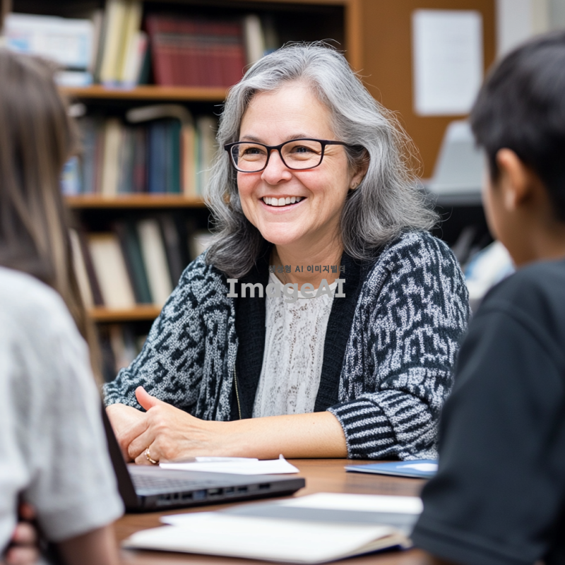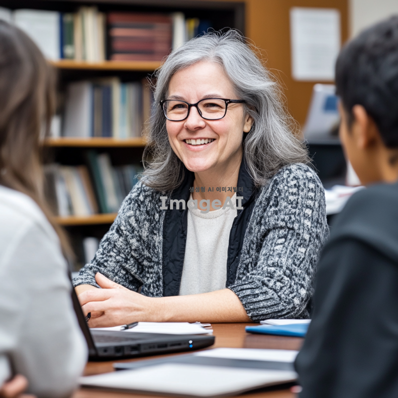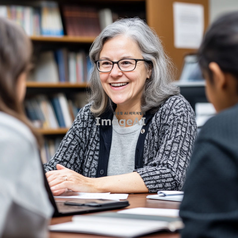 따뜻하고 인자한 미소를 짓고 있는 여성 멘토, 부드러운 눈빛과 친절한 표정을 가진 모습, 실내에서 책상에 앉아 학생들과 함께 대화하는 장면, 주변에는 책과 노트북이 놓여 있어 지식과 배움의 환경을 암시, 온화한 색조의 배경, 편안하고 격려하는 분위기, 다양한 연령대의 학생들이 함께하며 존경과 신뢰를 나타내는 장면.