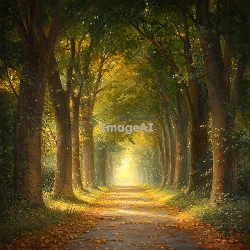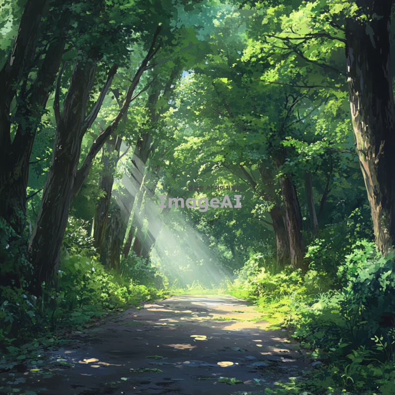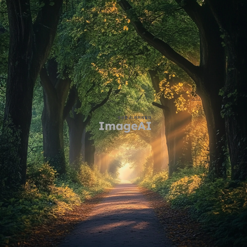 아름다운 숲속의 평화로운 오솔길, 길 양옆으로는 풍성한 녹색 나무들이 줄지어 서 있고, 부드러운 햇살이 나뭇잎 사이로 스며들어 길을 밝히는 장면. 길 끝에는 희미하게 보이는 목적지가 있어, 그곳을 향해 나아가는 느낌을 주는 이미지. 자연의 고요함과 동시에 앞으로 나아가고 싶은 열망을 불러일으키는 분위기.