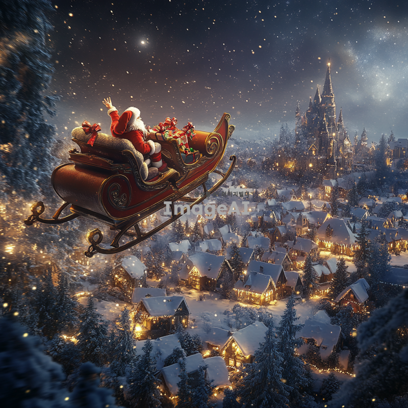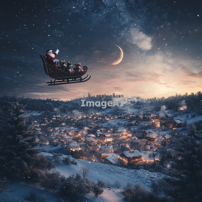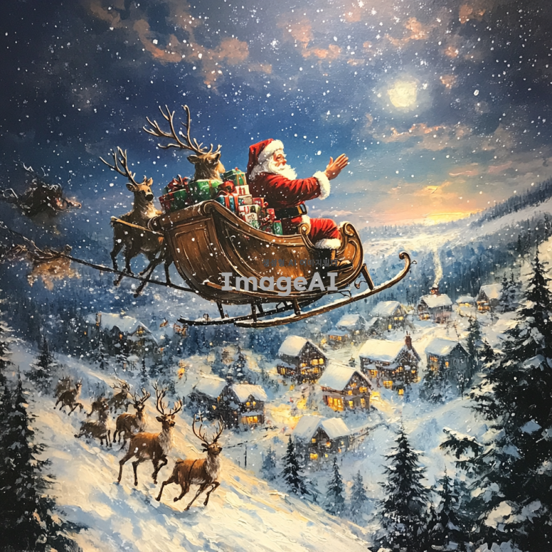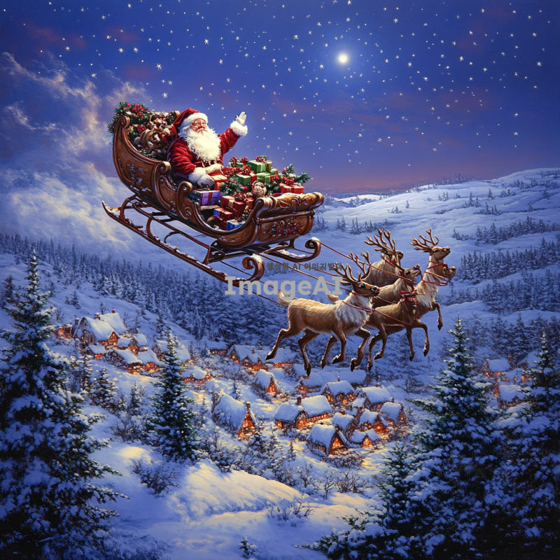크리스마스 밤 하늘을 배경으로 날아가는 설매를 끄는 순록과 함께 있는 산타클로스, 반짝이는 별들이 가득한 하늘, 눈 덮인 마을과 숲이 아래에 펼쳐져 있는 장면, 설매에는 선물이 가득 담겨 있으며 산타는 행복한 표정으로 손을 흔드는 모습, 따뜻하고 환상적인 크리스마스 분위기, 부드러운 달빛이 풍경을 비추는 장면.