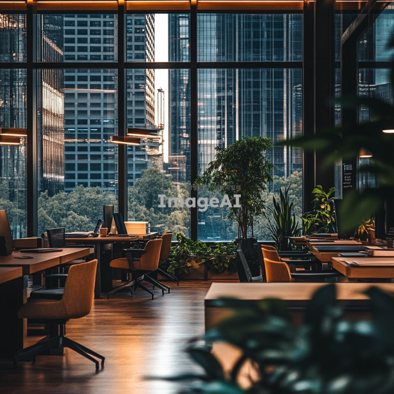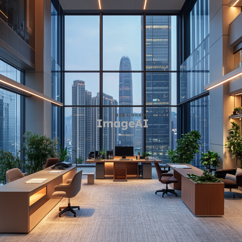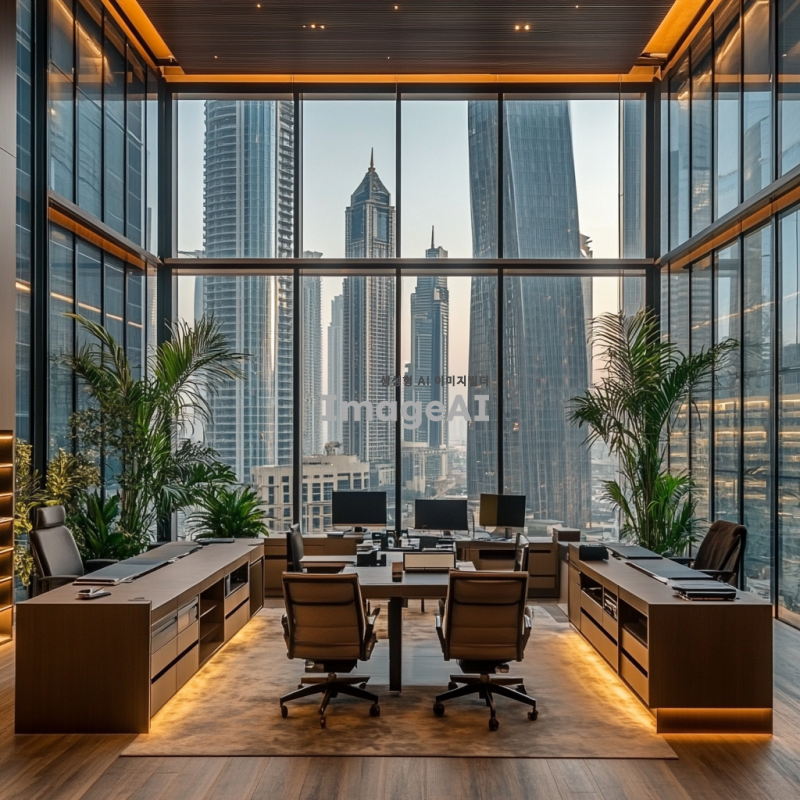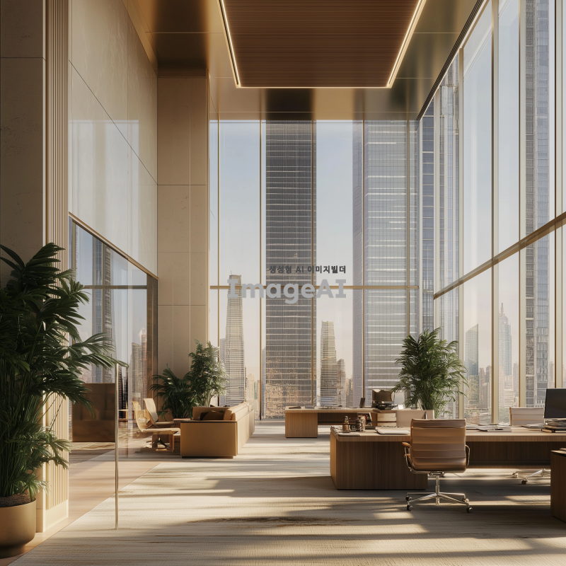 현대적인 사무실 내부, 넓고 깔끔한 디자인, 고급스러운 가구 배치, 적당히 높은 층고, 큰 유리창을 통해 보이는 도시의 고층 빌딩들, 자연광이 잘 들어오는 밝은 분위기, 미니멀리즘 스타일, 따뜻한 색조의 조명, 세련된 인테리어 디테일, 깔끔하게 정리된 책상과 서류, 초록색 식물이 곳곳에 배치된 모습.