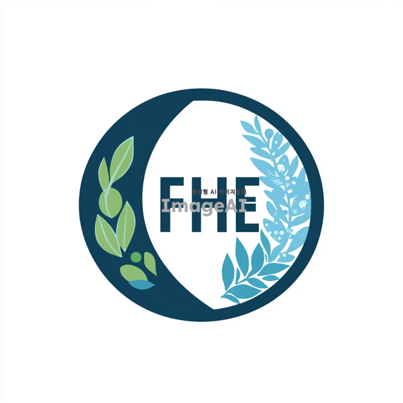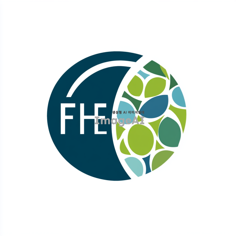 심플하고 현대적인 디자인의 FHE 로고, 푸른색과 녹색의 조화를 이루며 환경과 평화를 상징하는 요소 포함, 둥글고 부드러운 선을 사용하여 친근하고 포용적인 느낌을 주는 스타일, 세련되면서도 눈에 띄는 디자인, NGO 단체의 신뢰성을 강조하는 요소 포함, 로고에 자연을 연상시키는 작은 아이콘이나 패턴 추가.