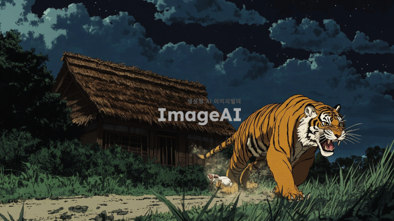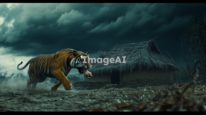 시골 초가집을 배경으로, 어두운 하늘 아래에 위치한 전통적인 초가집이 보입니다. . 화면의 왼쪽 방향으로 호랑이가 뛰어가고 있으며, 호랑이의 입에는 작은 토끼가 물려 있습니다. 호랑이는 역동적이고 빠른 움직임을 보여준다