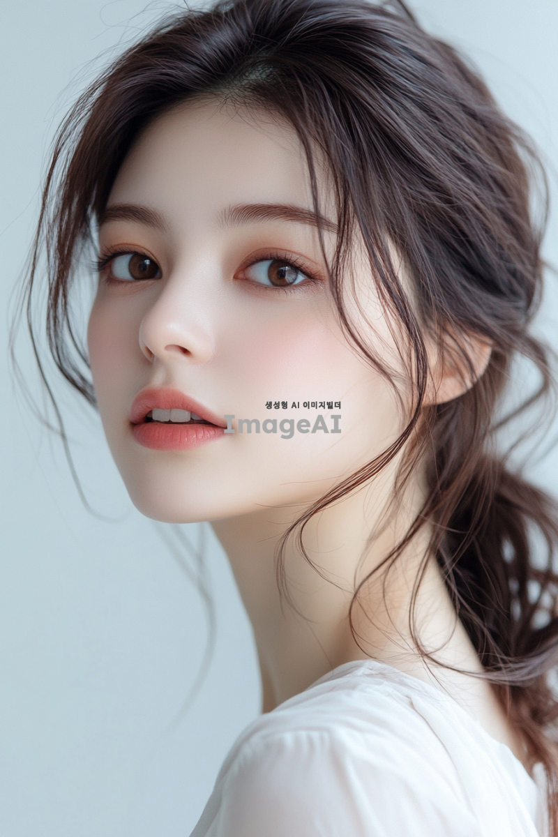 청순한 이미지의 여성 얼굴, 드뮤어 룩 스타일, 부드러운 조명, 자연스러운 메이크업, 자연스러운 웨이브, 진갈색 헤어, 깨끗하고 맑은 피부, 온화한 미소, 심플하고 우아한 의상, 화이트 배경, 핑크빛의 연한 색조 화장, 고급스러운 분위기.
